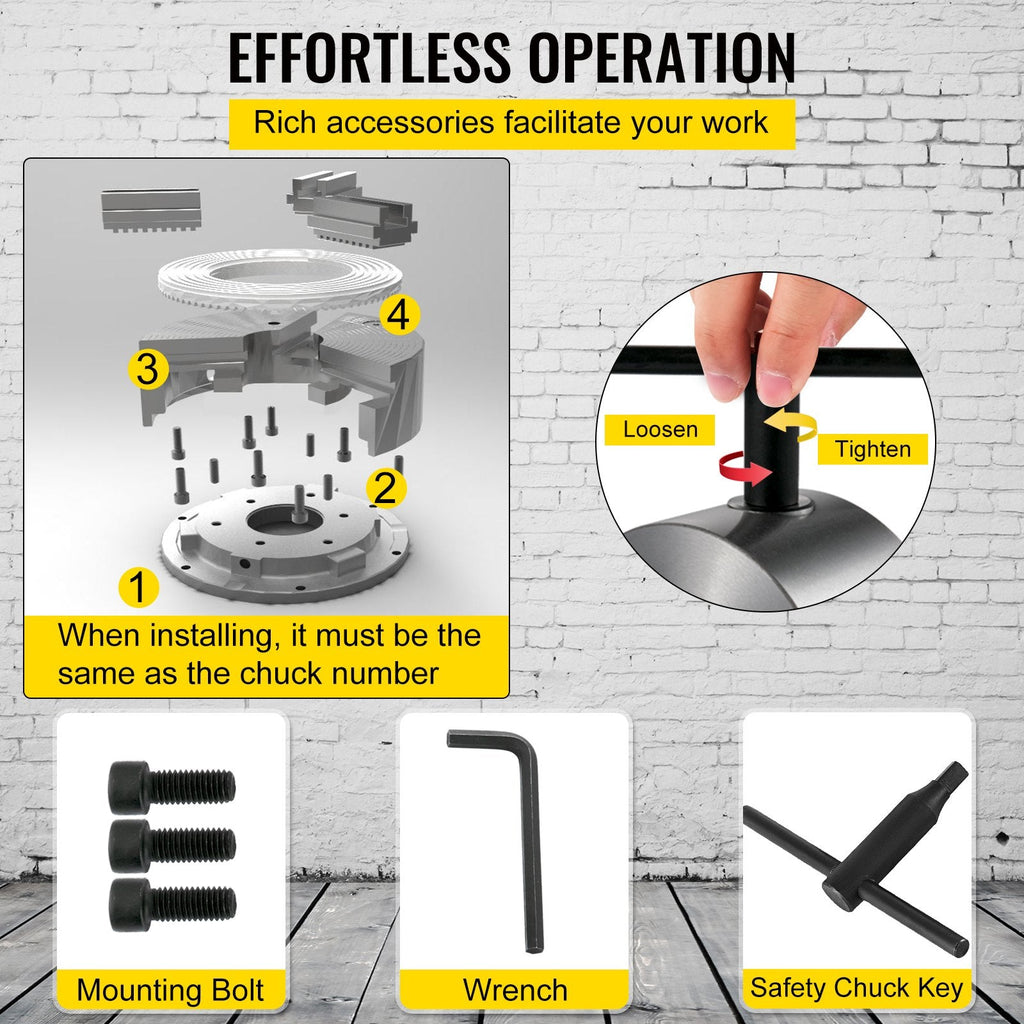 The VEVOR K11-200 Lathe Chuck is an 8-inch self-centering 3-jaw chuck engineered for precision and durability. Constructed from hardened steel, this chuck delivers reliable performance for lathe, drilling, and milling machine applications. It is designed for accurate internal and external grinding, making it a dependable choice for various machining tasks.