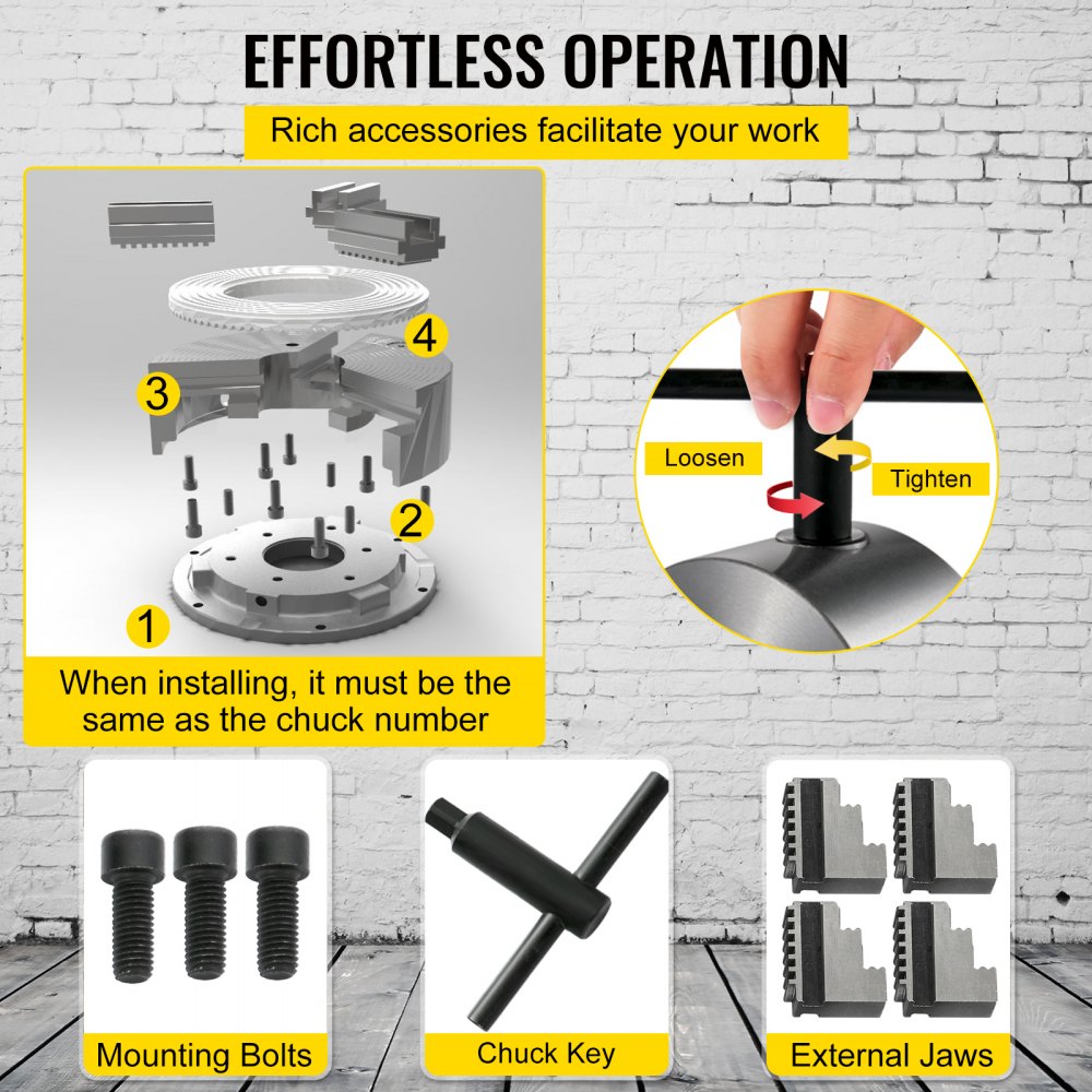 The VEVOR K12-160 Lathe Chuck is a 6.3" self-centering 4-jaw chuck designed for precision and versatility in machining tasks. Ideal for metal lathes, grinding machines, and milling machines, it offers reliable and accurate centering for a wide range of workpieces. Equipped with two sets of jaws, this chuck provides flexible clamping options. Built for durability and consistent performance, it’s a must-have for professional machinists.