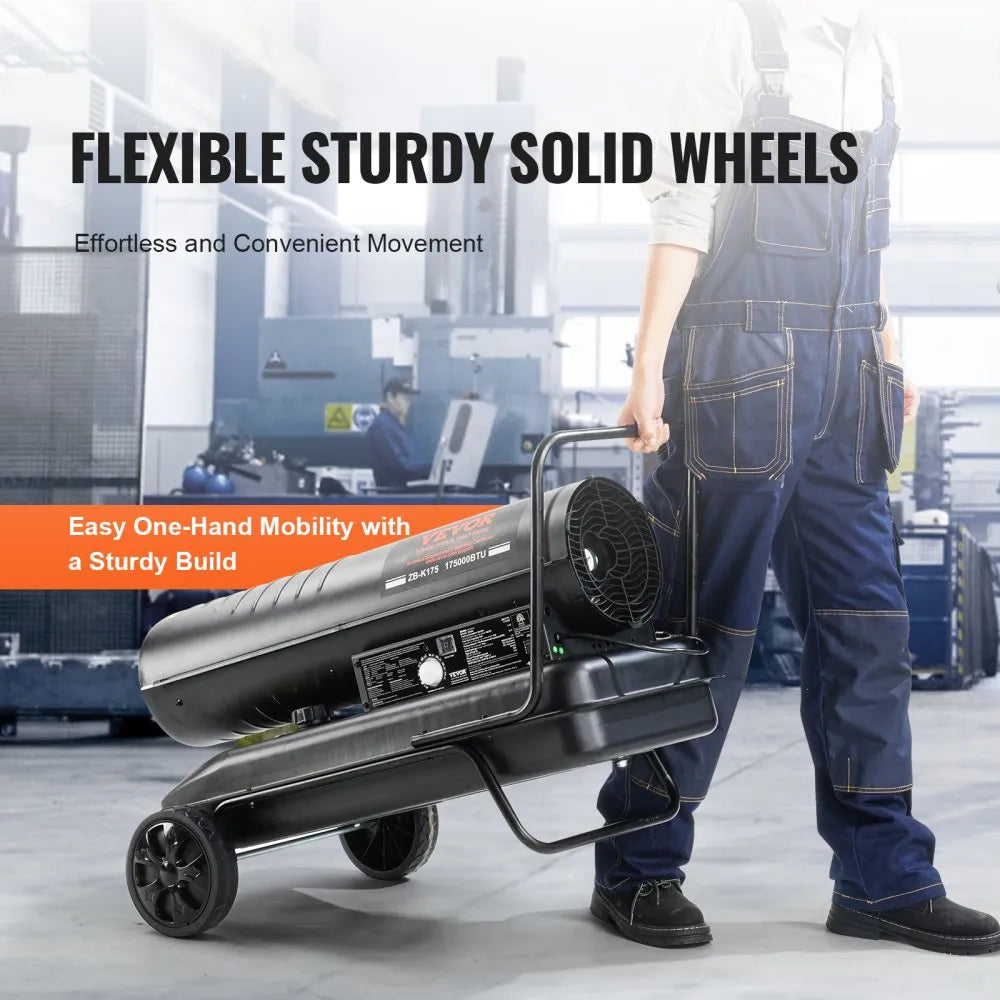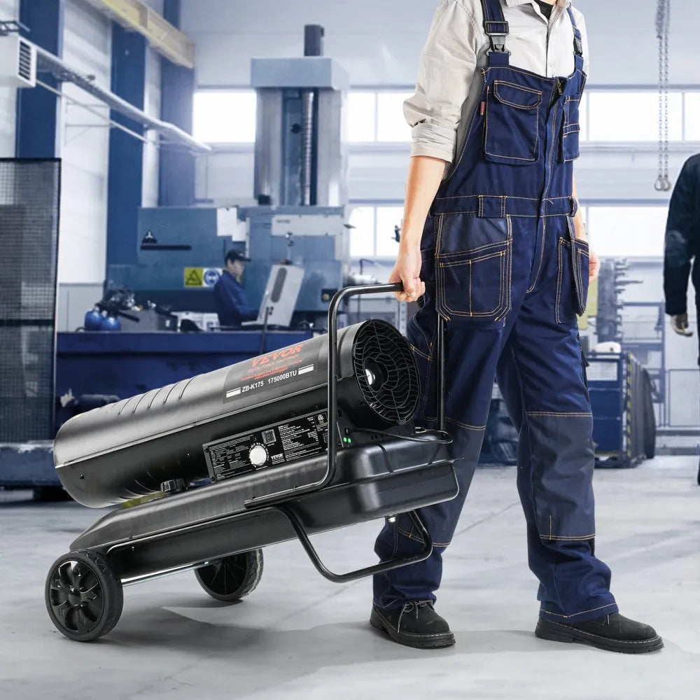 The VEVOR 175,000 BTU Kerosene Forced Air Heater is a heavy-duty, portable torpedo heater designed for indoor and outdoor use in workshops, barns, construction sites, and industrial settings. It delivers rapid heating to spaces up to 36,021 cu ft / 1,020 m³. Equipped with a thermostat and adjustable room temperature display (40–110°F / 5–45°C), it automatically stops heating when the set temperature is reached, saving energy. Compatible with both kerosene and diesel fuels (use one at a time), it features a 13.2-gallon fuel tank that provides up to 9.5 hours of continuous heat. The heater includes safety features such as low-fuel auto shutoff, overheat protection, dual fuel filters, and a fuel gauge for easy monitoring. Its lightweight design with a convenient handle ensures mobility and flexible use in a variety of scenarios.