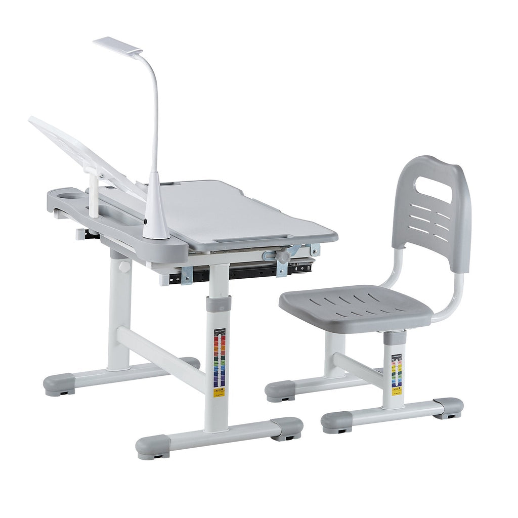 The VEVOR Kids Chair and Desk Set in grey is designed to provide comfort and ergonomic support for growing children. Featuring an adjustable tilted desktop that promotes healthy posture, this set is ideal for study, drawing, or creative activities. Both the chair and desk are height-adjustable to grow with your child, ensuring long-lasting use. With sturdy construction and efficient storage solutions, this desk set offers both practicality and durability. The simple, modern grey color complements any room decor, making it perfect for home or school use.