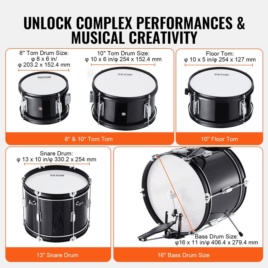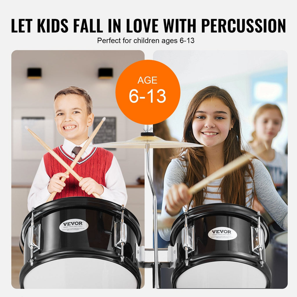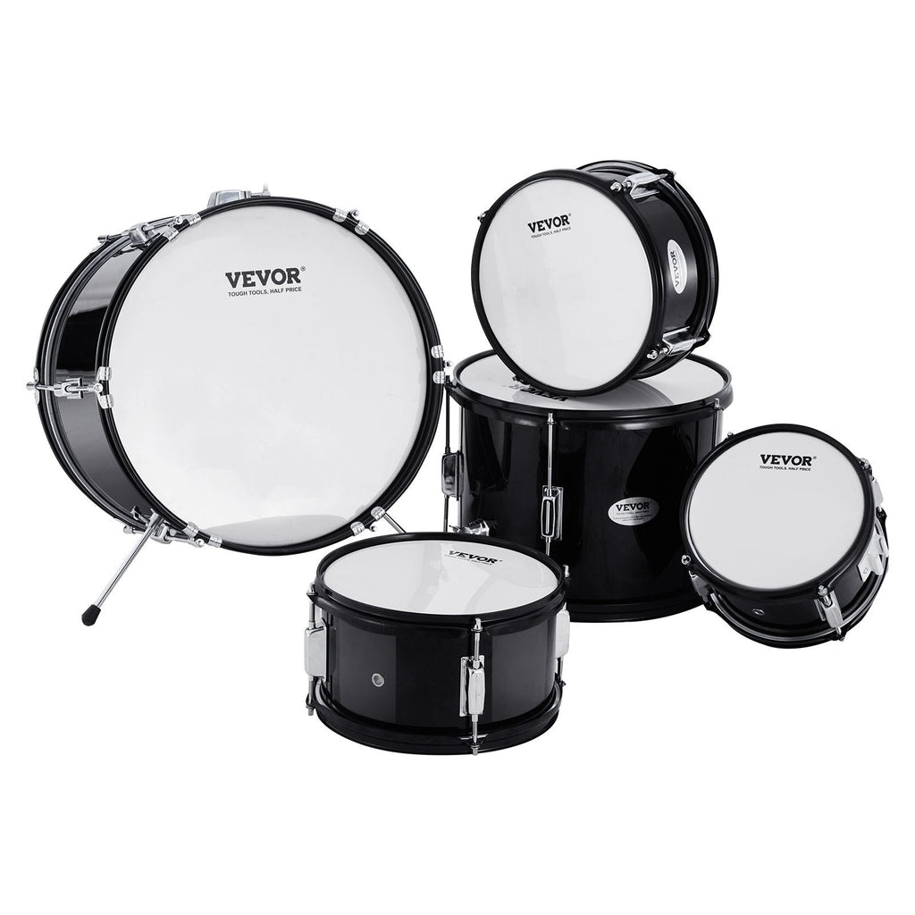 Let your child's musical talent shine with the VEVOR 5-Piece Kids Drum Set. This beginner-friendly full drum kit includes everything young drummers need to learn and play like pros: a 16" bass drum, multiple toms, a snare, floor drum, cymbal, and hi-hat. Built from durable poplar, PET, and carbon steel, and paired with an adjustable throne and essential accessories, this kit provides professional sound in a child-friendly size. With a sleek black finish and solid construction, it’s perfect for igniting a lifelong love of music.