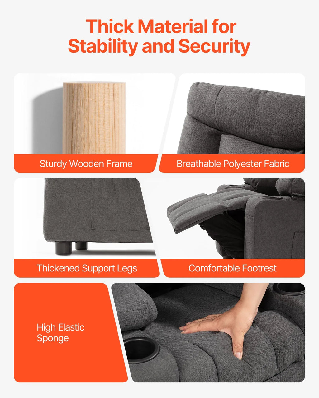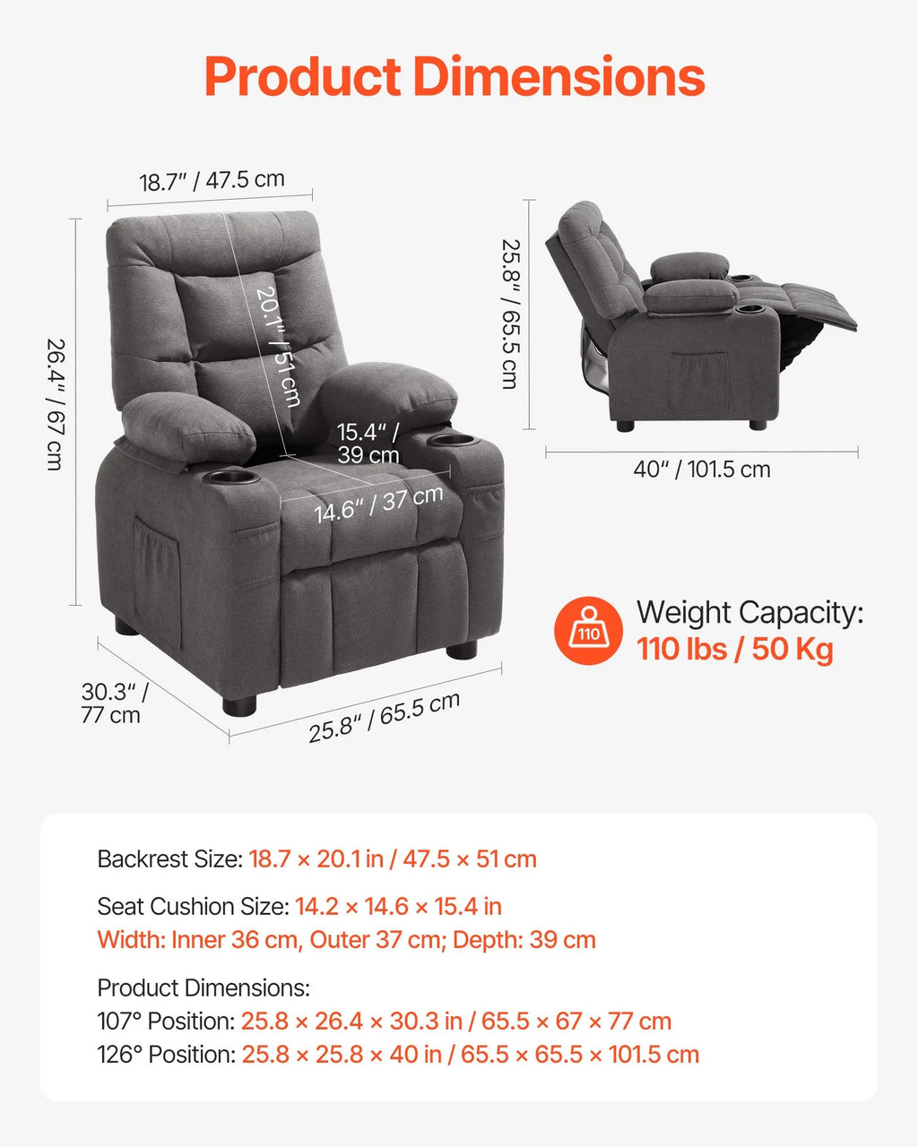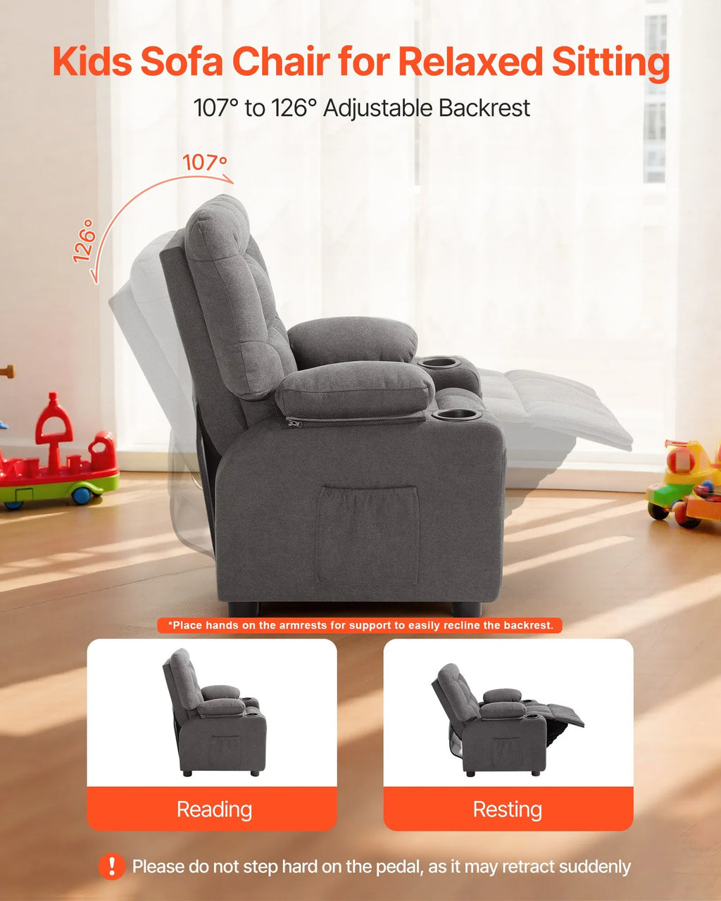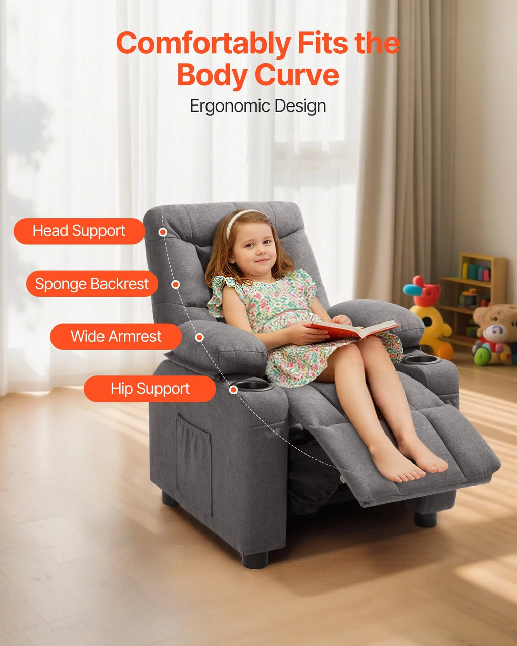 VEVOR Kids Reclining Chair Toddler Recliner with Cup Holders and Pockets is a high-quality, durable solution designed for comfort, convenience, and safe seating. Constructed with a sturdy wooden frame, soft sponge padding, and breathable fabric, it provides a cozy and supportive seating experience for toddlers. The adjustable backrest allows multiple reclining angles, while the built-in cup holders and storage pockets add practical functionality. This versatile recliner is ideal for parents, caregivers, and educators seeking a stylish and functional seating option for young children.
