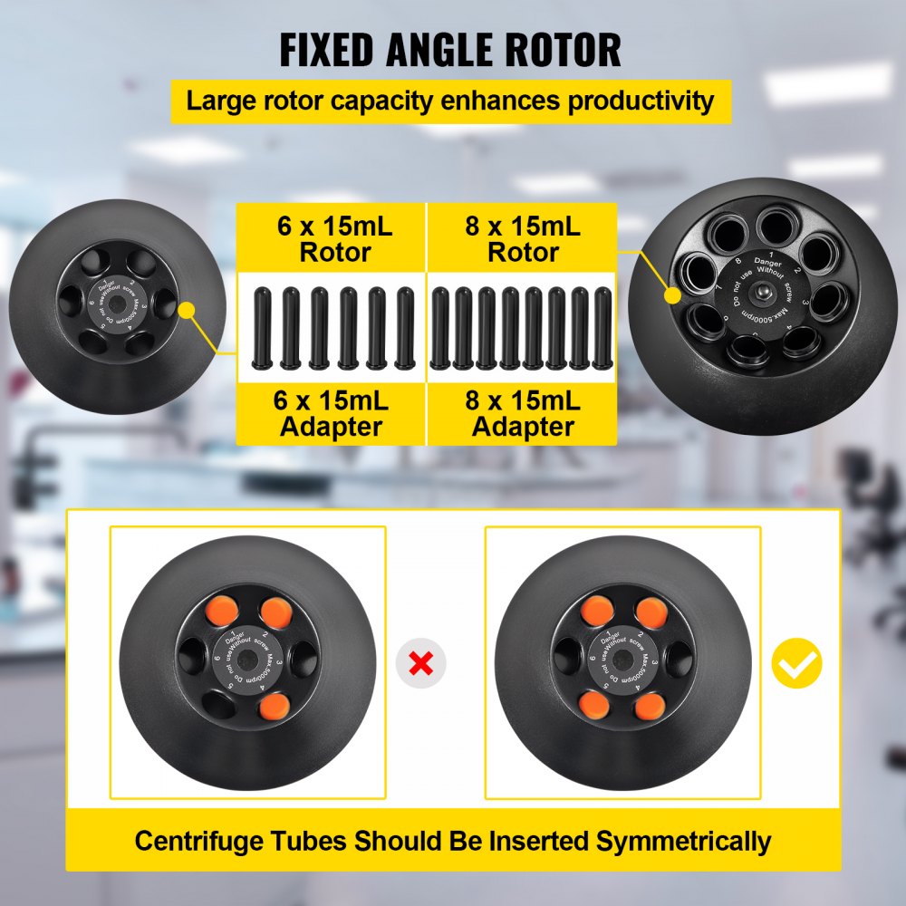 The VEVOR Lab Benchtop Centrifuge offers precision and efficiency in a compact design, ideal for laboratory, clinical, and educational environments. Designed to handle 8 x 15mL tubes, this high-performance centrifuge delivers a variable speed range of 500–5000 RPM with a maximum RCF of 3074xg. The clear LCD display allows users to monitor speed and time settings easily, while its low-noise operation ensures a quiet workspace. With a timer range from 10 seconds to 99 minutes, it is perfect for various sample separation needs including blood, urine, and biological samples.