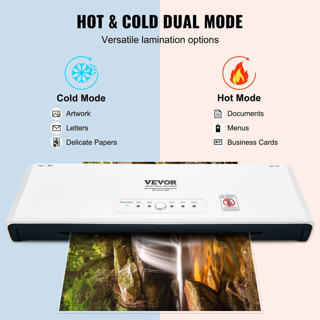 The VEVOR 13-Inch Laminator offers high-efficiency lamination for home, office, or school use. Designed with four rollers and support for both hot and cold lamination, it delivers smooth, bubble-free results across a range of materials. With quick warm-up, a lamination speed of 285 mm/min, and compatibility with film thicknesses from 3 to 10 mil, this machine handles everything from ID cards and photos to menus and certificates. The user-friendly design ensures simple operation, while durable construction guarantees long-term performance and document protection.