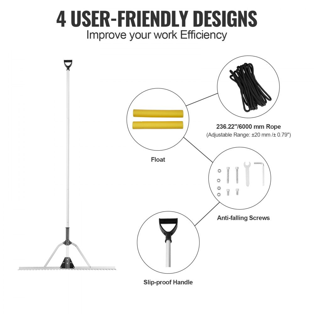 Tackle tough yard and lake cleanup with the VEVOR 36" Landscape Rake. Built with a wide aluminum head and an adjustable 102" handle, this versatile tool is perfect for clearing weeds, loosening soil, and managing lake or pond debris. Designed for both professionals and beginners, the rake features 34 strong tines and includes a rope and float for efficient aquatic use.