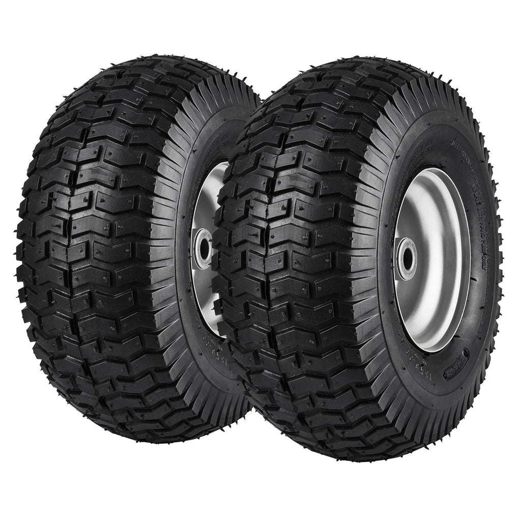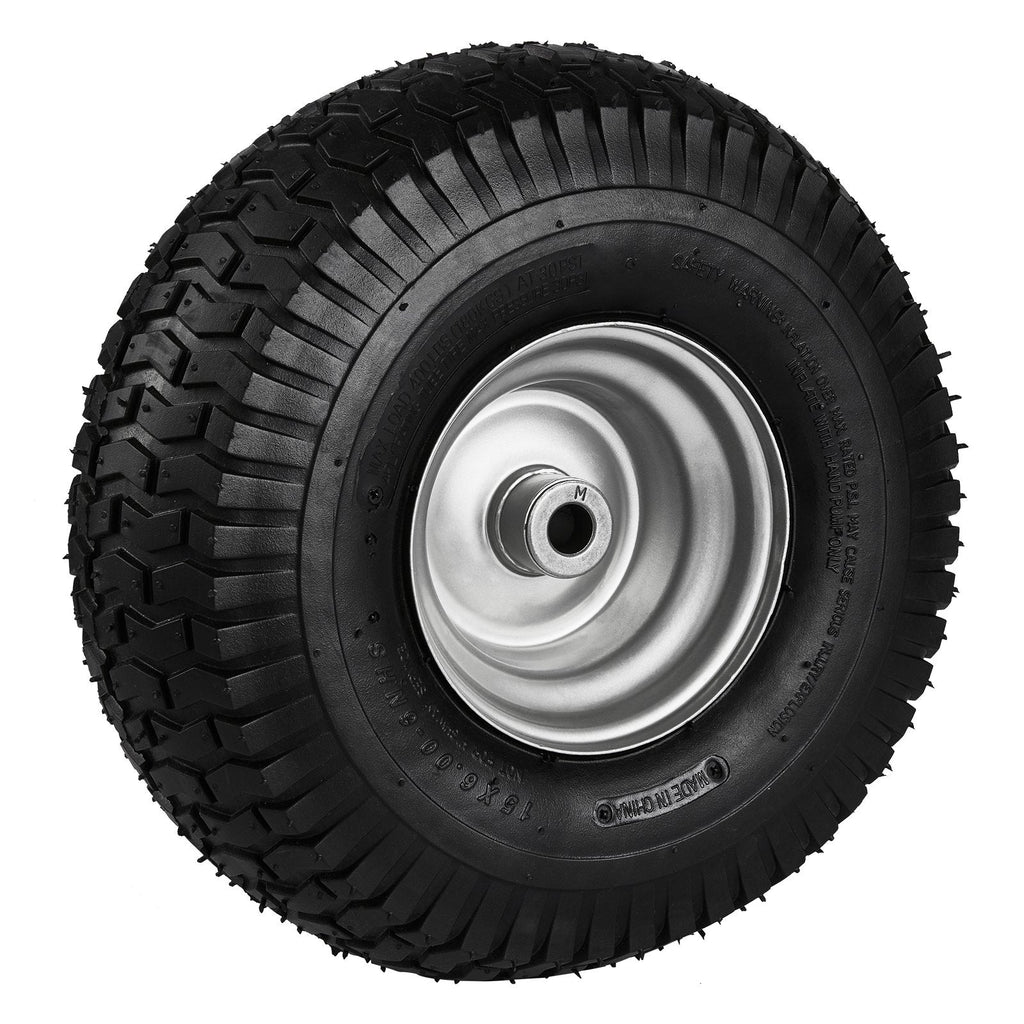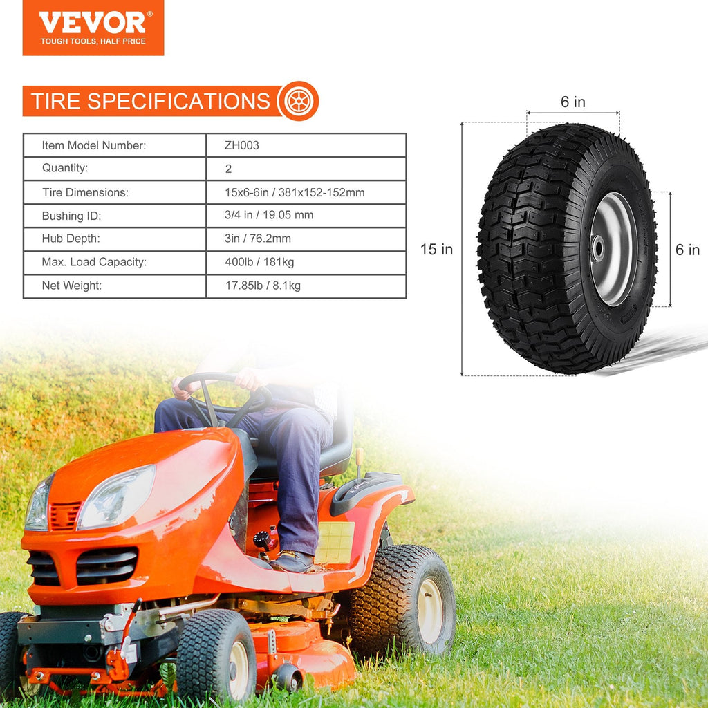Upgrade your lawn tractor with the VEVOR 15x6-6" Lawn Mower Tire and Wheel Assemblies. This 2-pack set includes turf-friendly pneumatic tires with pre-mounted wheels, designed for smooth traction and minimal turf damage. Each tire supports up to 400 lbs and features a 3" centered hub with a 3/4" bushing, plus 16 adapters to ensure a secure fit across various lawn tractor models. Built for durability and performance, they’re ideal for riding mowers, garden tractors, and utility carts.