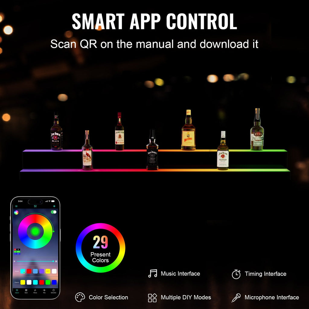 Elevate your bar or entertainment space with the VEVOR 60" LED Lighted Liquor Bottle Display Shelf. Featuring vibrant multicolor LED lighting and dual control via RF remote and mobile app, this 2-step acrylic shelf adds both function and flair. Crafted from premium transparent acrylic for a sleek look, it offers wide compatibility with multiple power options and versatile placement. Whether you're showcasing spirits at a home bar, restaurant, or club, this display shelf makes a bold, modern statement.