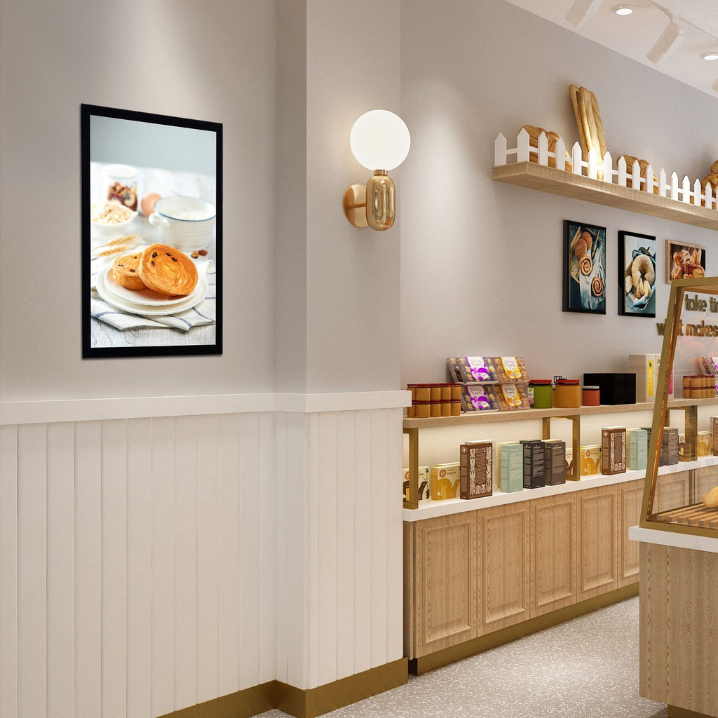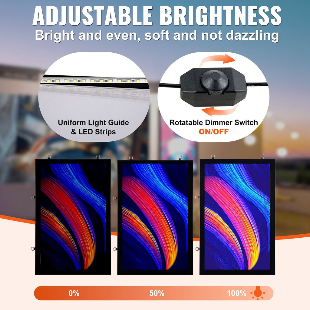 Showcase your message with style and clarity using the VEVOR 16" x 24" LED Poster Frame. This backlit display sign features brilliant LED illumination, enhancing visibility for posters, advertisements, or menus. The slim aluminum frame and acrylic panel offer a modern, durable design suitable for both horizontal and vertical wall mounting. The magnetic front cover makes poster changes effortless, while low power consumption keeps energy use minimal—perfect for retail, restaurants, offices, and events.