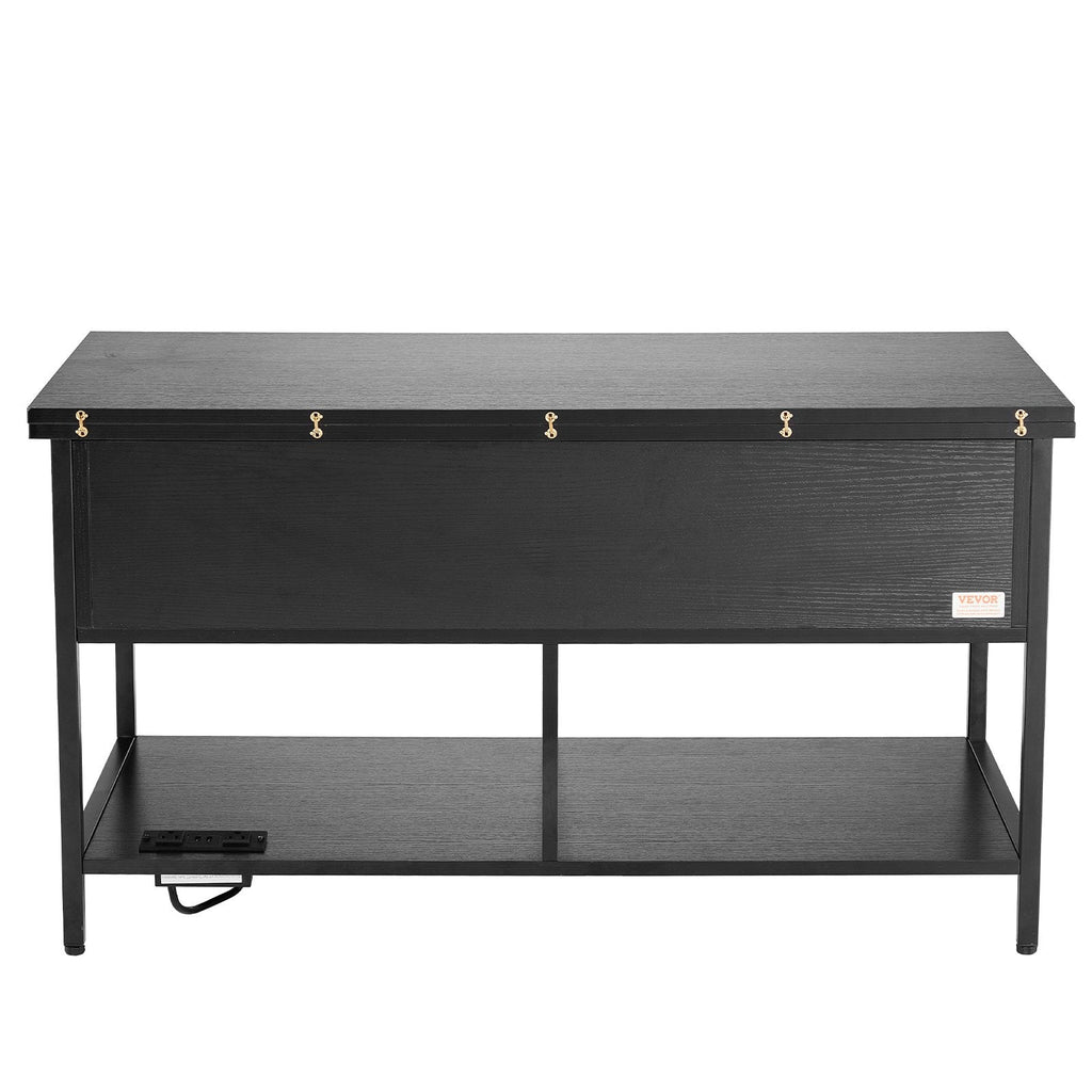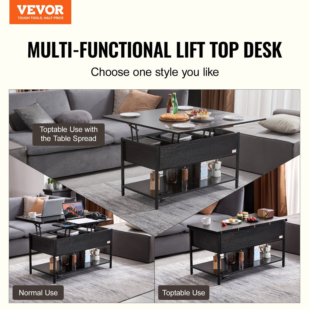 Elevate your living space with the VEVOR Lift Top Coffee Table, a stylish and multifunctional piece designed to meet modern needs. This sleek black table features a gas-spring lift top that adjusts to provide extra workspace for working, eating, or enjoying entertainment. Equipped with built-in power outlets, including two three-pin sockets and two USB ports, it offers convenient charging options. With ample storage, including two adjustable desktops and a spacious lower layer, this table is perfect for organization and functionality. The color-changing ambient light adds a touch of ambiance to your room, making it the perfect blend of style and practicality.