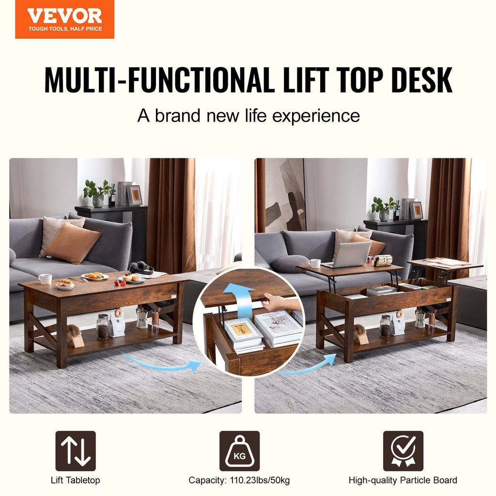 Enhance your living space with the VEVOR Lift Top Coffee Table, designed to combine modern functionality with style. Featuring a thickened steel frame and two spacious storage layers, this coffee table offers ample space for organization and convenience. The adjustable lift-top design allows you to comfortably work or dine at an optimal height, with a maximum lift of 25.2 inches. Its waterproof and scratch-resistant surface ensures durability while adding a sleek, contemporary look to your room. Quick and easy to assemble, this coffee table is a practical addition to any home or office.