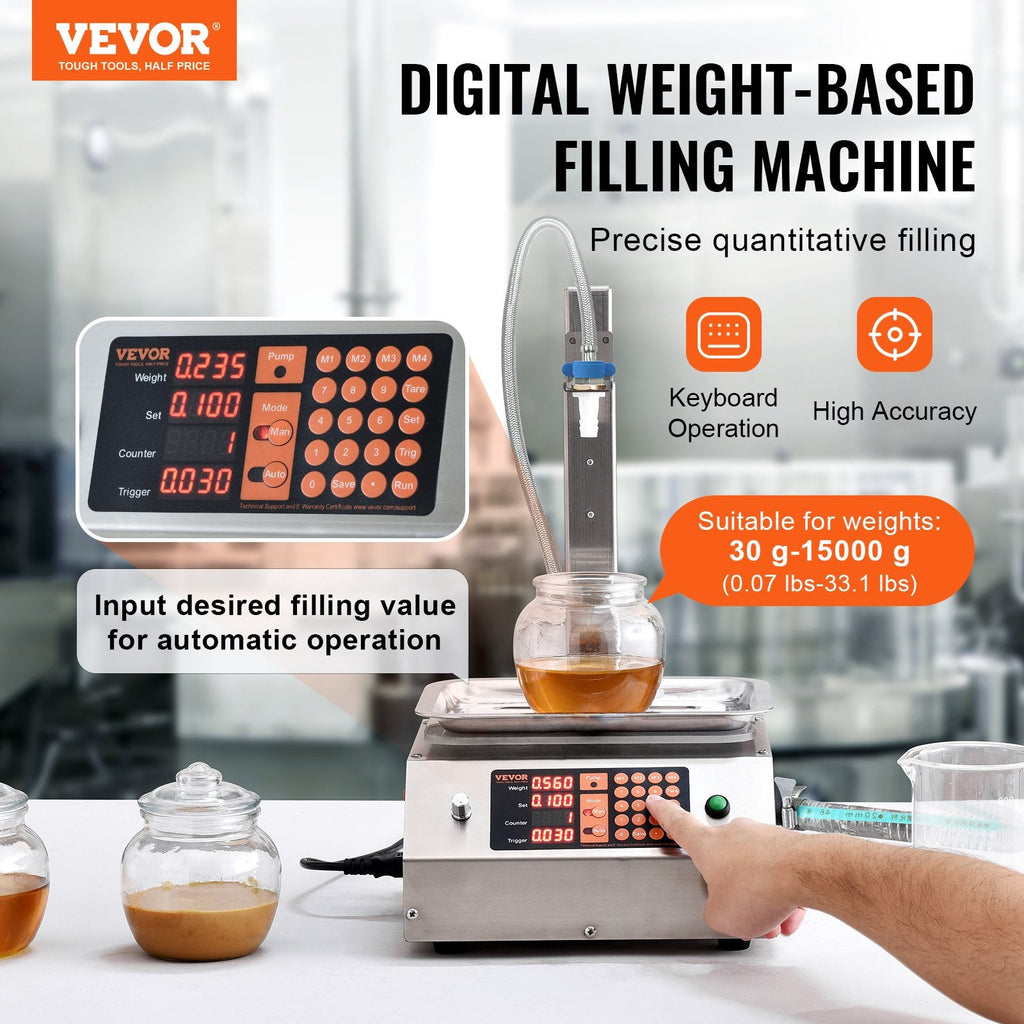Simplify your bottling process with the VEVOR Liquid Filling Machine. Designed for a wide range of liquids such as milk, water, oil, wine, beverages, detergent, and shampoo, this automatic bottle filler ensures high precision and efficient operation. Featuring a weighing capacity of 30-15,000 g (0.07-33.1 lbs) per fill, this machine provides rapid and accurate filling with a maximum flow rate of 574.9 fl. oz/min (17L/min).