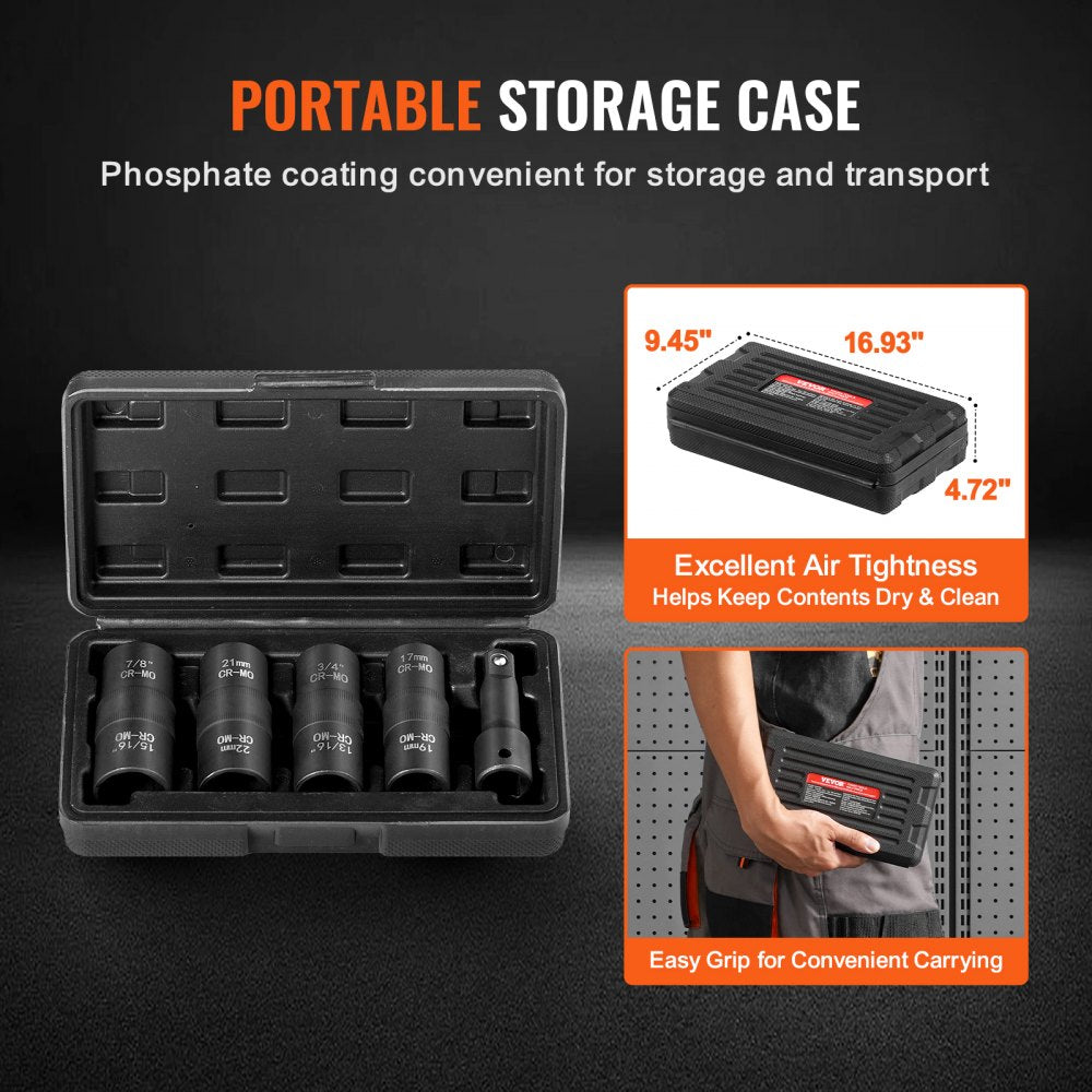 The VEVOR Lug Nut Impact Socket Set is designed to provide professional-grade performance for both industrial and home repairs. This 4-piece socket set features a 1/2-inch flip lug nut socket with both SAE and Metric sizes for versatility. Each socket is made from durable Cr-Mo material, ensuring maximum strength and long-lasting use. The 6-point socket design provides a secure grip, making it easier to loosen or tighten lug nuts without stripping. The easy size identification allows for quick selection, while the portable storage case keeps everything organized and easily accessible.