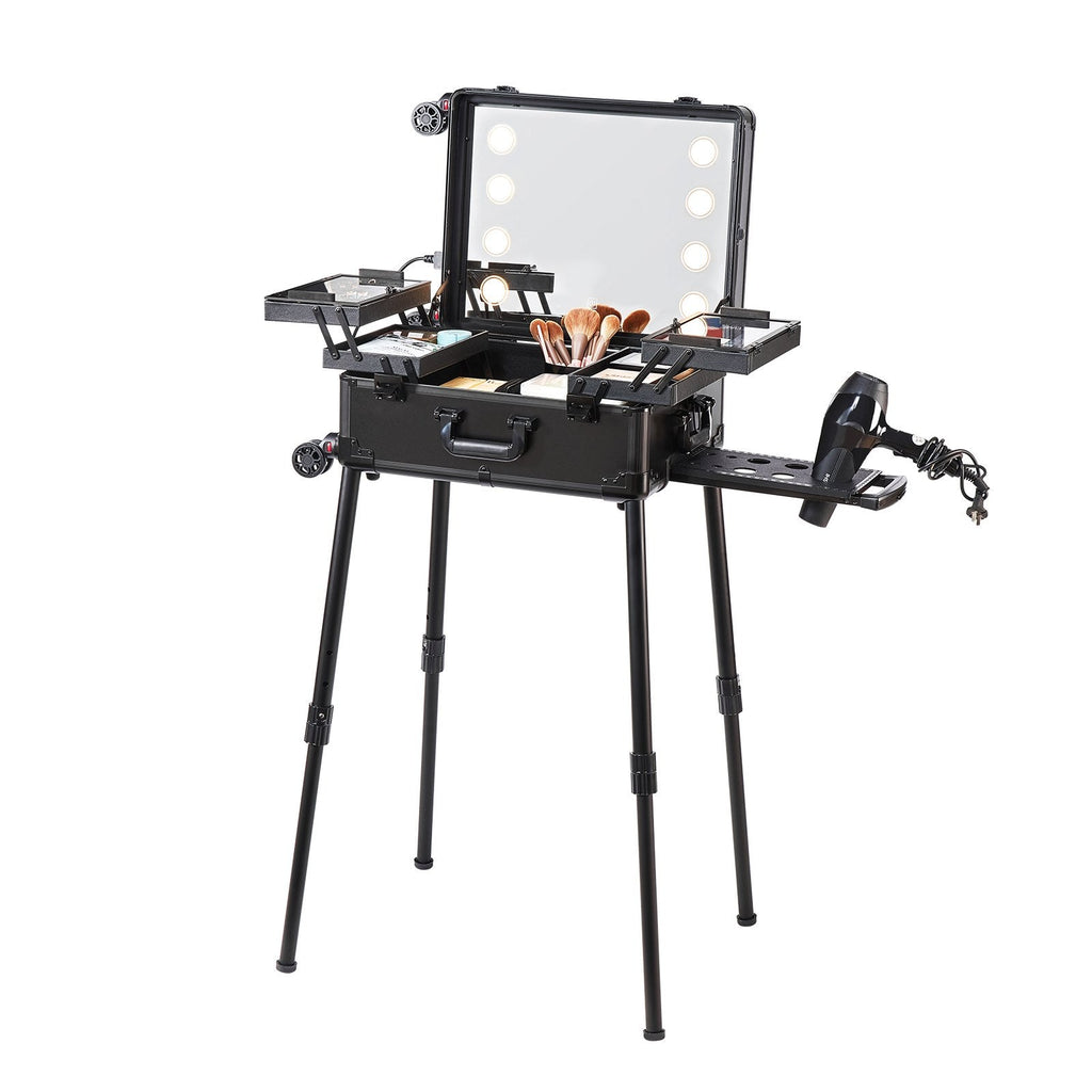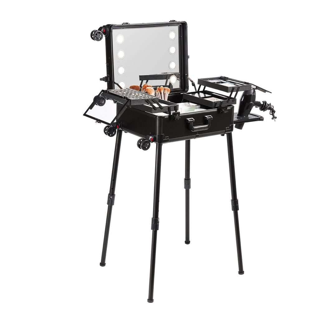 The VEVOR Makeup Train Case with Lock is a professional artist's ultimate cosmetic organizer. Featuring a large capacity with 4 storage trays, a lighted mirror, and brush holder, this case is designed for both storage and convenience. Whether you're traveling or working in a studio, the included swivel wheels and adjustable support legs offer easy mobility and stability. Made from durable materials like ABS, MDF, and an aluminum frame, this case is lightweight yet sturdy, making it perfect for makeup artists on the go.