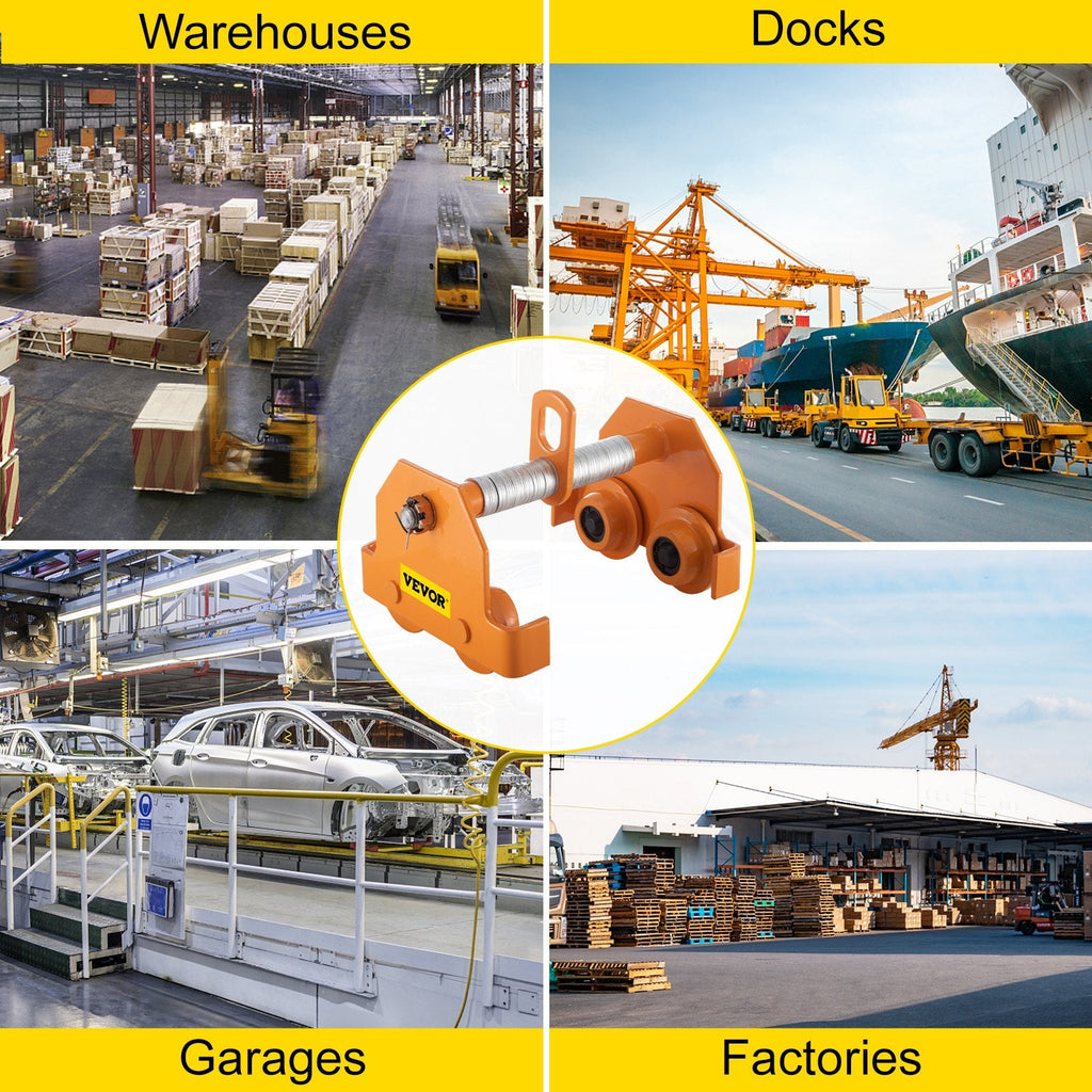 The VEVOR Manual Trolley is engineered for heavy-duty lifting with a robust load capacity of 6600 lbs (3 tons). Designed to fit both straight and curved I beams, its adjustable width ranges from 3.5 to 8 inches for versatile use. Equipped with dual wheels, this trolley ensures smooth and stable movement along beam tracks. The steel construction with powder coating provides enhanced durability and resistance to corrosion and wear. Perfect for garage hoists, industrial environments, and heavy material handling applications.