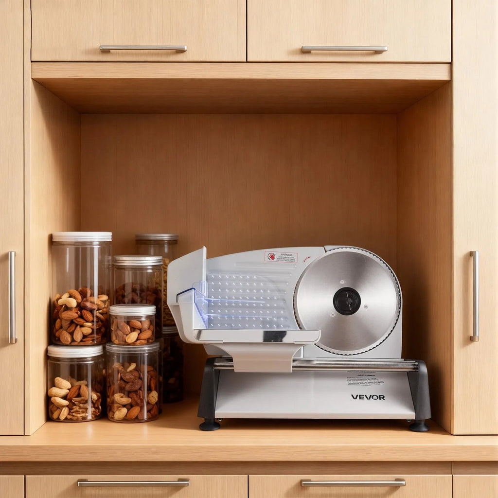 Experience fast, smooth, and precise slicing with the VEVOR 7.5" Electric Meat Slicer. Powered by a 200W motor and equipped with a sharp SUS420 stainless steel blade, this compact deli slicer delivers clean, consistent cuts for meats, cheeses, breads, and vegetables. With adjustable thickness control, user-friendly cleaning, and built-in safety features, it’s a reliable choice for home kitchens and small food-prep setups.