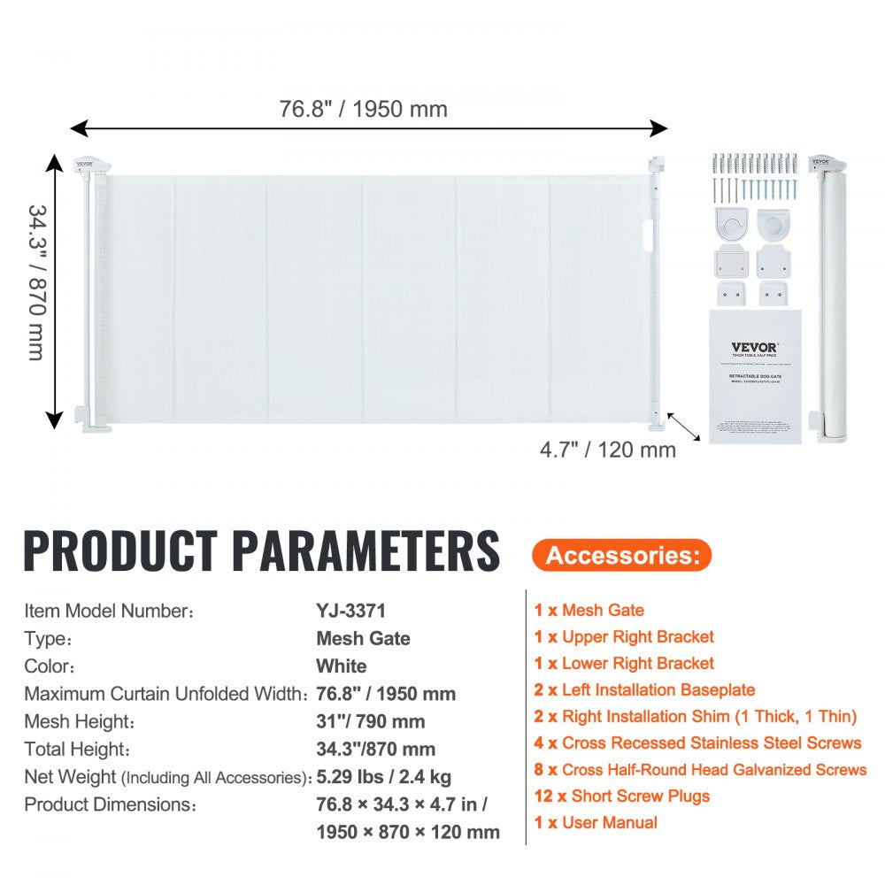 Keep your little ones and pets safe with the VEVOR Mesh Baby Gate. This retractable gate extends from 34.2" up to 76.8" wide, providing flexible coverage for doorways, stairs, hallways, and playrooms. Made with durable mesh and a sturdy white frame, it blends seamlessly with your home décor while offering reliable protection. Easy to install and retract, it’s perfect for busy households that need quick, adjustable safety solutions.