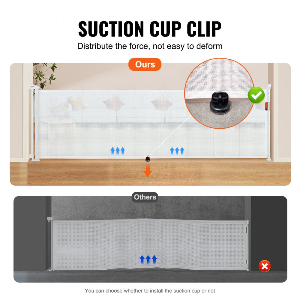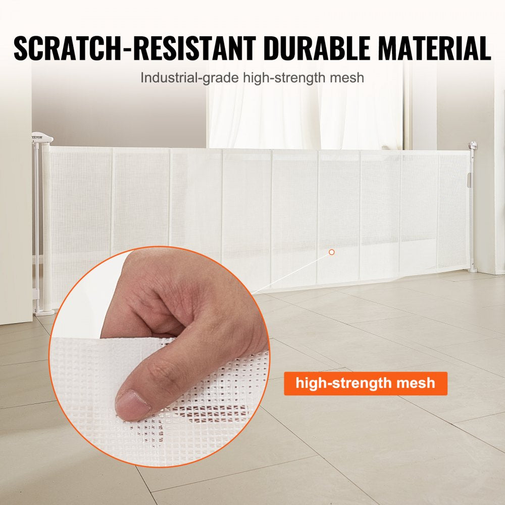 Create a safe and flexible space for your little ones or pets with the VEVOR Retractable Mesh Baby Gate. Standing 34.2 inches tall and extending up to 116.1 inches wide, this retractable gate combines functionality and design, fitting seamlessly into doorways, hallways, stairs, and playrooms. The mesh design ensures visibility and airflow while the one-hand operation makes daily use effortless for parents or pet owners. Durable and secure, this gate is built with high-strength materials to withstand active use in busy households.