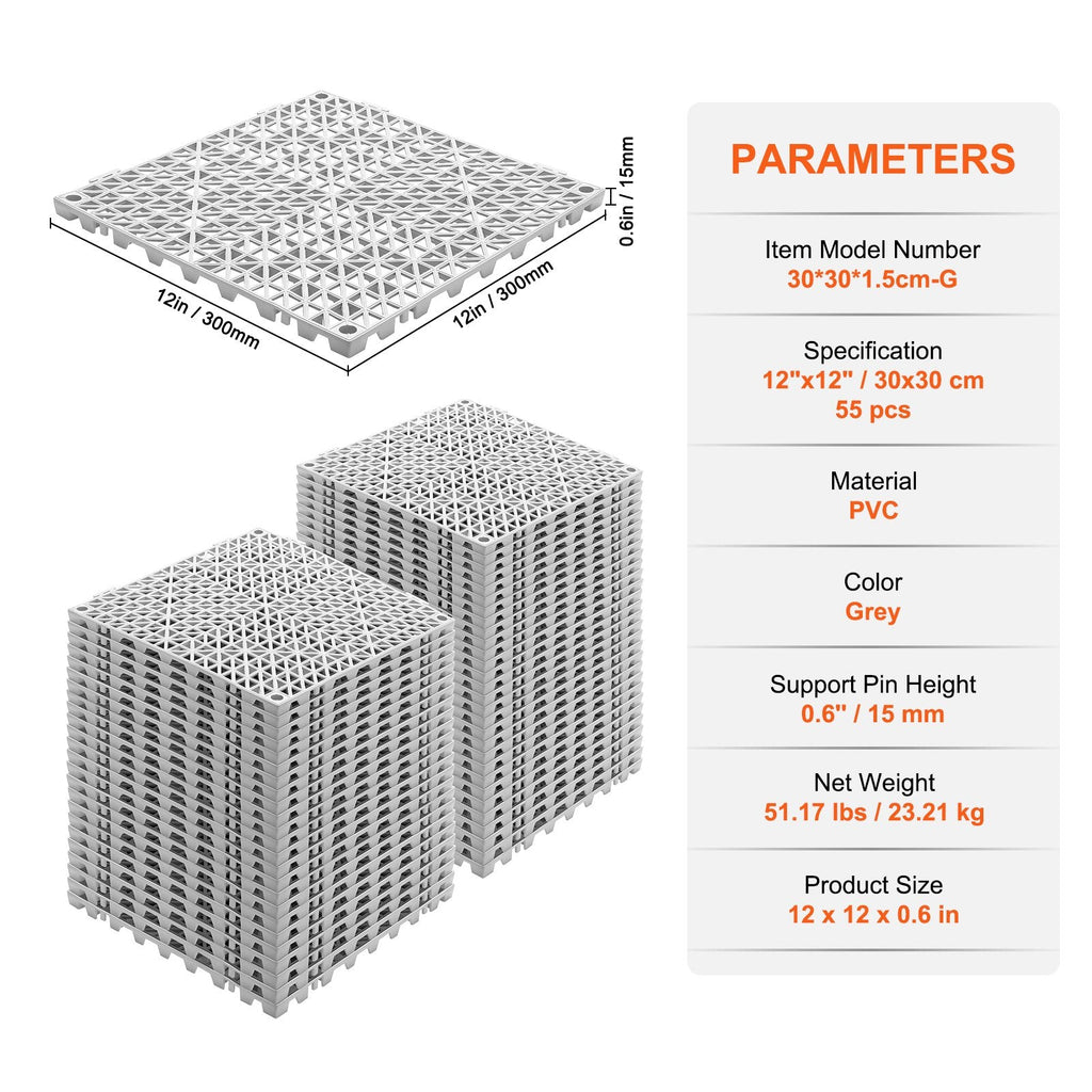 Transform wet or slippery areas into safe, dry, and comfortable spaces with the VEVOR Modular Interlocking Cushion Mats. This 55-pack of 12" x 12" soft PVC tiles offers a practical flooring solution for bathrooms, restrooms, kitchens, locker rooms, pools, or any high-moisture environments. The non-slip design features open drainage holes to channel away water efficiently, while the cushioned construction provides comfort underfoot. Designed for easy snap-together installation and low-maintenance care, these mats offer lasting durability and performance in both commercial and residential settings.