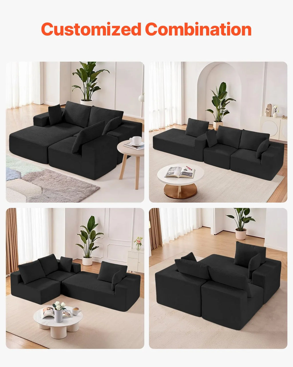 The VEVOR Modular Sectional Sofa is a stylish and comfortable L-shaped cloud couch designed for versatile living spaces. Featuring a chaise and plush cushions, this sofa provides ultimate relaxation for lounging or entertaining. Its modular design allows for customizable layouts to fit any room, while wide armrests and soft corduroy fabric add both comfort and elegance. No assembly is required, and the sofa comes in durable packaging for safe delivery.