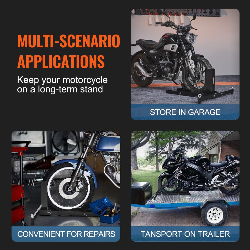 Secure your motorcycle with confidence using the VEVOR Motorcycle Wheel Chock Upright. Engineered for stability and strength, this heavy-duty steel stand supports up to 1800 lbs (816.5 kg) and fits 15" to 22" wheels with 3" to 8" tire widths. With six adjustable holes for a custom fit, it ensures a snug, upright hold for off-road and standard motorcycles. Ideal for maintenance, transport, or storage, the chock’s reinforced design delivers superior stability and durability.