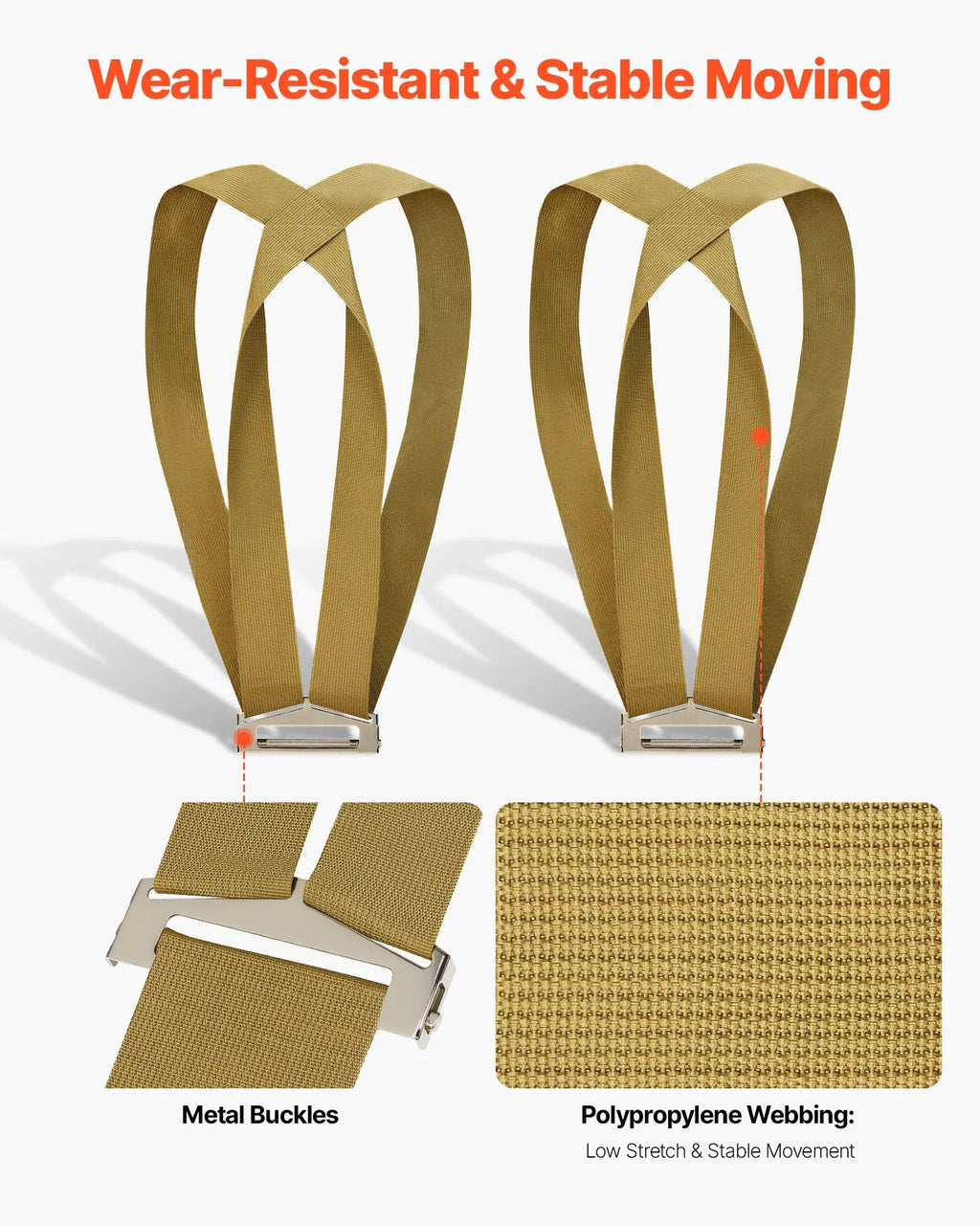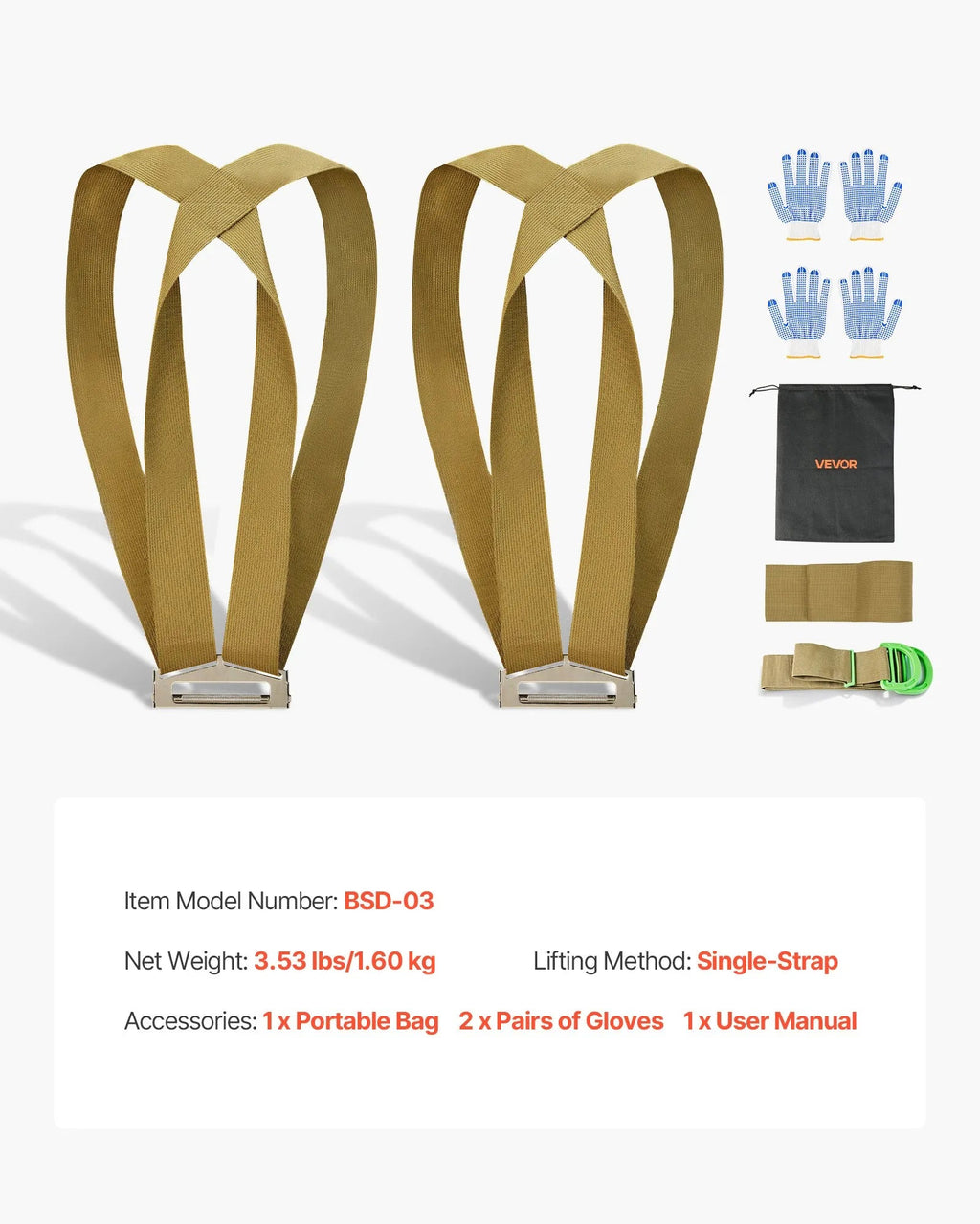 Move heavy furniture and appliances safely with the VEVOR Moving Straps BSD-03, a 2-person lifting system featuring harness straps, a load-bearing strap, and a handheld strap. Ergonomically designed for comfort, adjustable for various users, and made with durable materials, this system makes relocating items easier and safer.