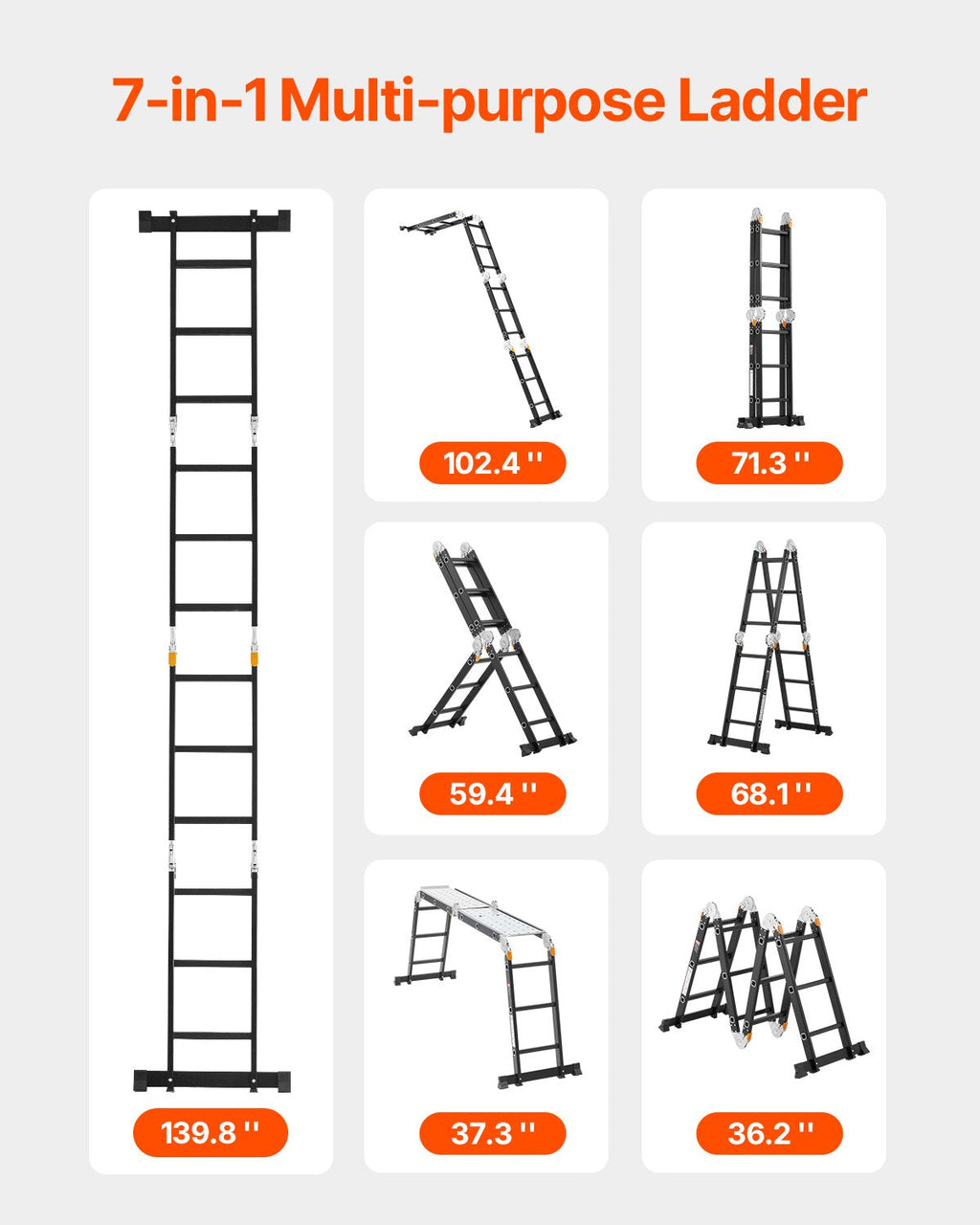 The VEVOR 7-in-1 Multi-Purpose Folding Ladder is a versatile and essential tool for various tasks around the house, office, or workshop. With its 7-in-1 design, this ladder can be easily transformed into a straight ladder, A-frame, scaffolding platform, and more, offering flexibility for every job. The anti-slip step tubes and additional foot pads ensure safety, while the robust scaffolding feature provides a reliable platform for working at height. Lightweight and compact, it’s easy to transport and store.