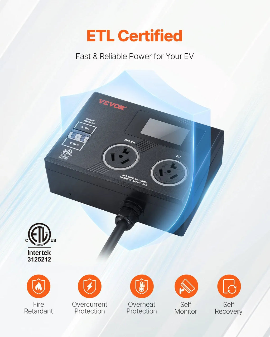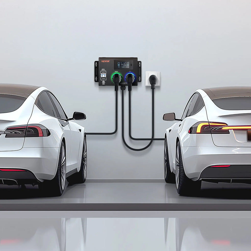The VEVOR NEMA Splitter for Dryer and EV is a smart power distribution solution designed to share a single NEMA 10-30 outlet between a dryer and an electric vehicle charger. Equipped with a clear 3.4-inch LCD screen, it allows easy monitoring of power usage and operating status. Built with flame-retardant PC V0 material and ETL certification, it provides safe and reliable power management. The intelligent load distribution automatically switches power between devices, making it a cost-efficient and convenient option for home EV charging without requiring additional electrical installation.