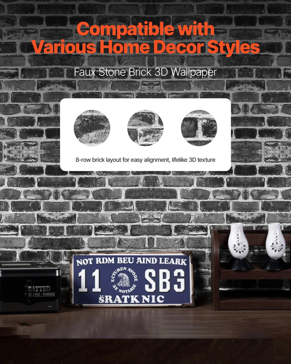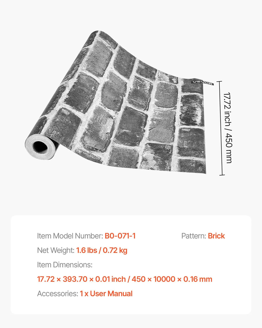 Upgrade your interior with the VEVOR Peel and Stick Wallpaper featuring a stylish gray brick design. This waterproof, self-adhesive vinyl roll is perfect for bedrooms, kitchens, bathrooms, offices, and desks. Its easy peel-and-stick installation, durable material, and precise cutting guidelines make DIY wall projects simple and efficient.