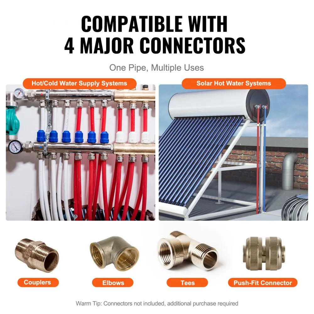 VEVOR PEX Pipe 3/4 Inch, 100 Feet Length PEX-B Flexible Pipe Tubing for Potable Water is a high-quality, durable plumbing solution designed for reliable hot and cold water supply systems. Made from strong PEX-B material, this flexible pipe provides excellent resistance to corrosion, scale buildup, and cracking. Its smooth inner surface helps maintain efficient water flow while ensuring long-term performance. Designed for easy installation, this PEX pipe is suitable for residential and professional plumbing applications and includes a free cutter and clamps for convenient setup.