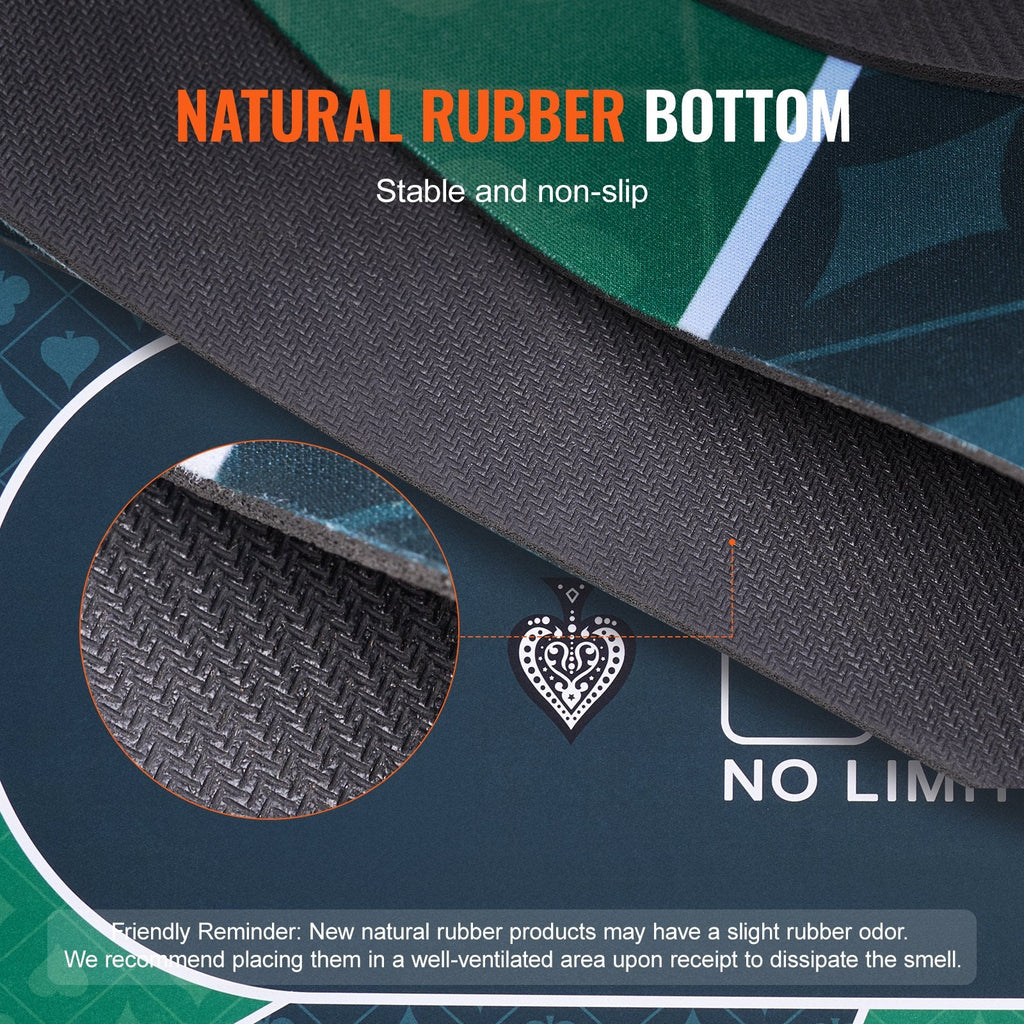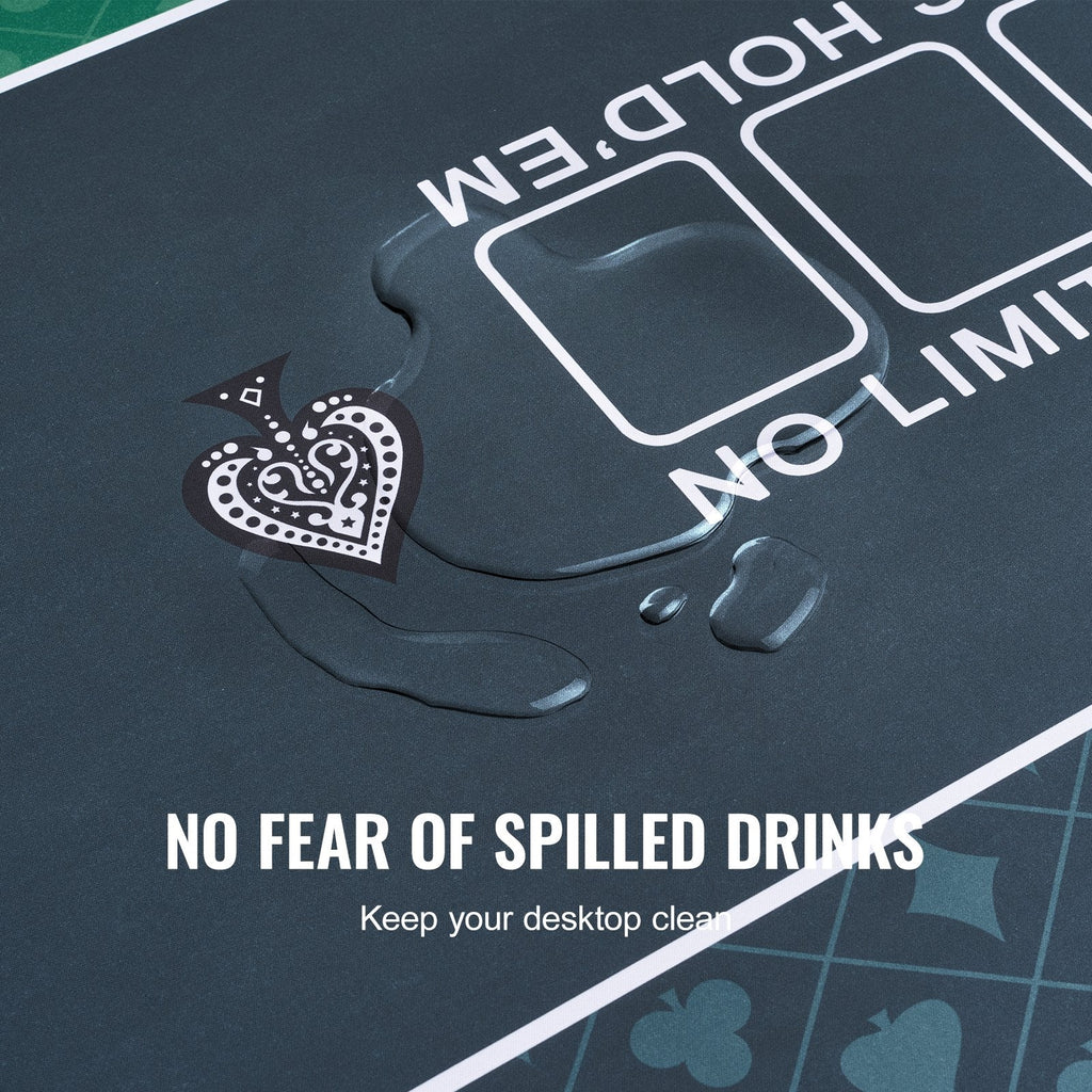 Bring the excitement of the casino to your home game nights with the VEVOR Poker Table Top. Measuring 70 x 35 inches, this mat comfortably seats 6-8 players and features a premium fabric surface for smooth card dealing and a natural rubber base for excellent grip. Its foldable, portable design and included carrying bag make it easy to transport and store. With an elegant green color, R45 rounded corners, and durable construction, this poker mat is perfect for tournaments, parties, and casual games alike.
