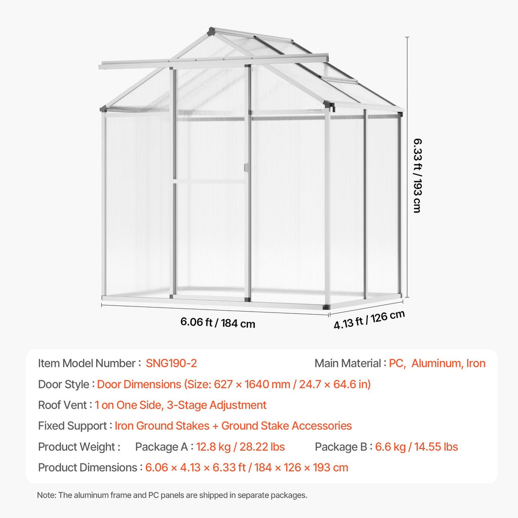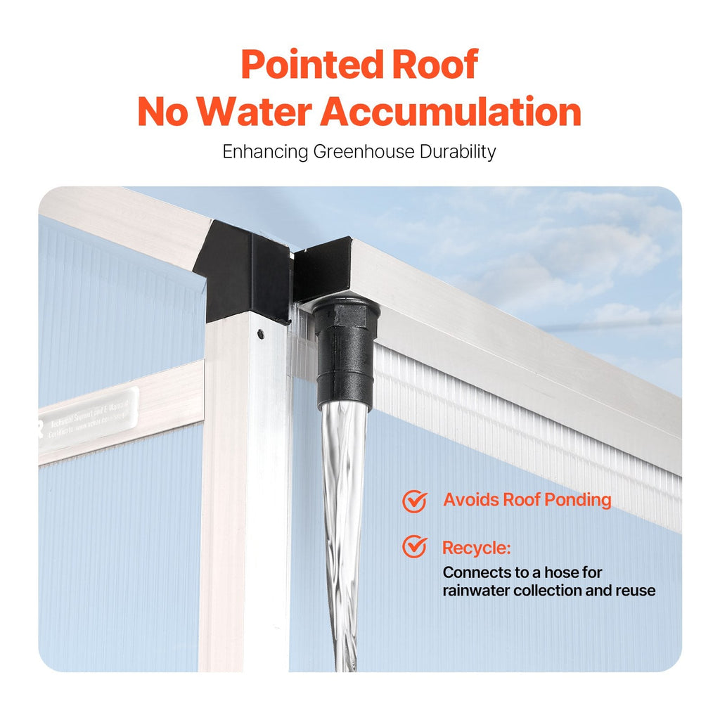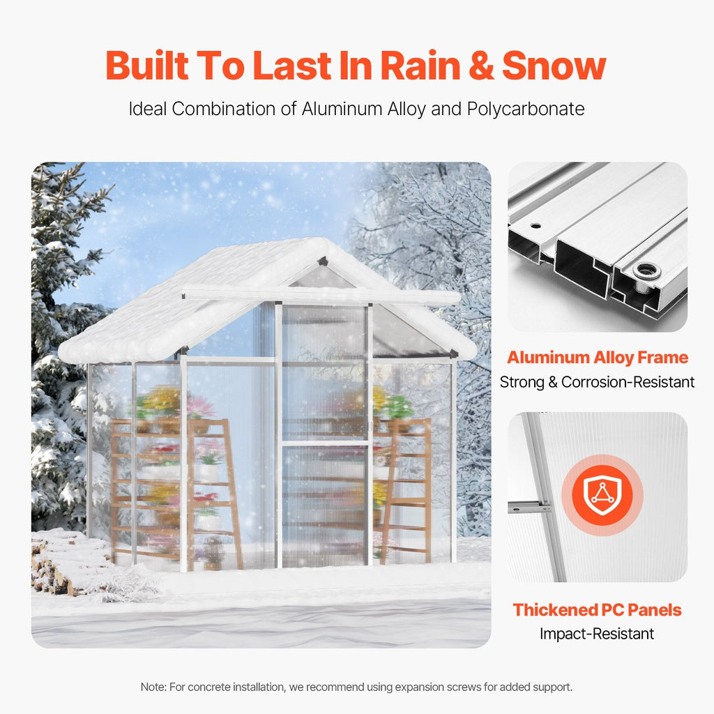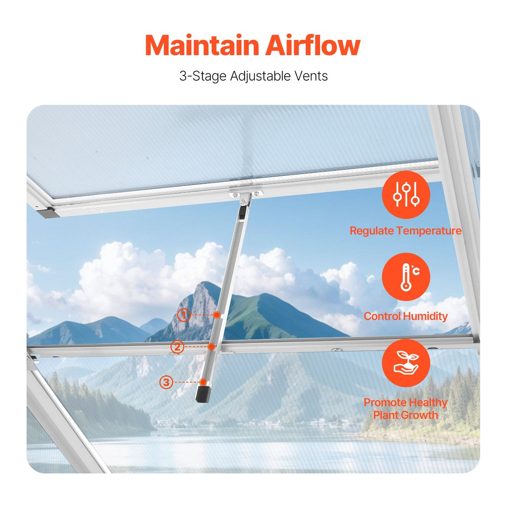The VEVOR Polycarbonate Greenhouse is designed to protect your plants and optimize their growth in any outdoor garden. This walk-in greenhouse provides impact resistance, helps reduce harmful UV rays, and maintains optimal air circulation for healthier plants. The multi-functional, waterproof design ensures durability and reliability throughout the year. The sliding door and adjustable roof vent offer easy access and enhanced ventilation, making it perfect for hobby gardeners or small-scale plant cultivation.