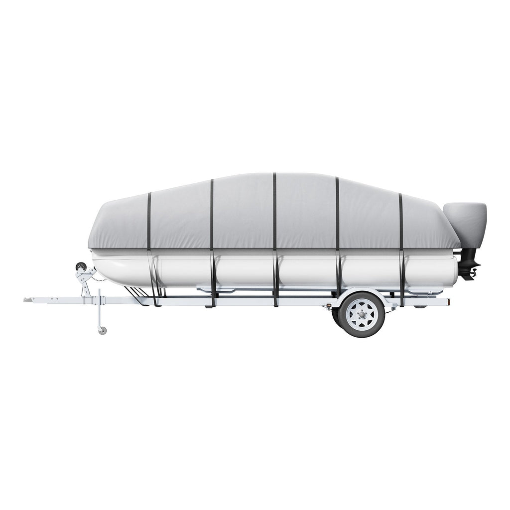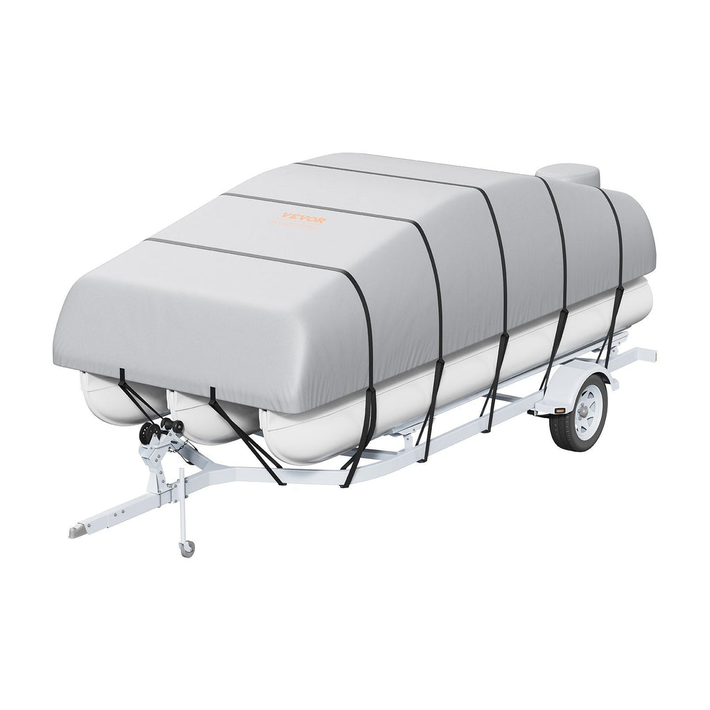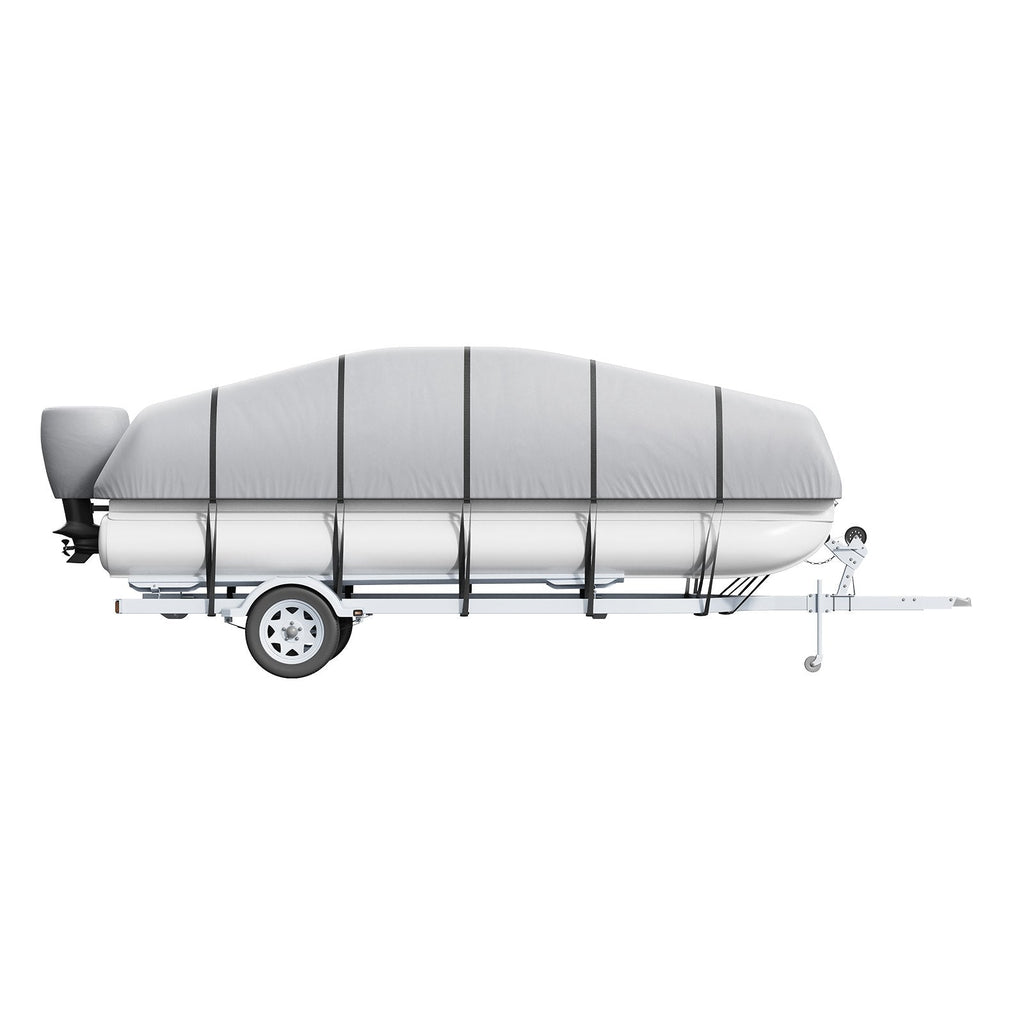 Protect your pontoon boat with the VEVOR 19'-20' Waterproof Trailerable Pontoon Cover, designed to withstand harsh weather and water conditions. Made from 800D marine-grade PU Oxford fabric, this durable cover is waterproof, tear-resistant, and offers reliable protection against sun, rain, and wind. It features a motor cover and 16 windproof buckle straps to ensure a secure fit during transport or storage. The cover is designed to fit pontoon boats ranging from 19' to 20' in length with a beam width up to 96", offering excellent coverage and peace of mind for your boat.