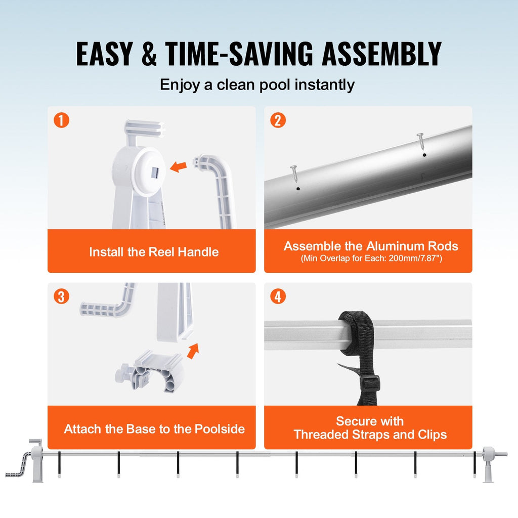 Make covering and uncovering your pool effortless with the VEVOR Pool Cover Reel. Designed for above ground swimming pools up to 20 ft wide, this solar cover reel features a sturdy aluminum frame and adjustable tube length to fit pools between 8.6 to 19.75 ft. With a reinforced triangular structure, dual-row screws for added stability, and a quick-setup design, it ensures lasting performance and convenience. The elevated axle height and 8-section aluminum tubing provide smooth rolling and even weight distribution, making pool maintenance simpler than ever.