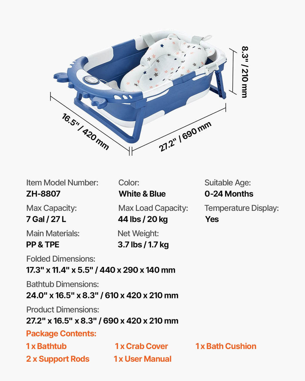 The VEVOR Portable Baby Bathtub is a durable and convenient solution for bath time with your little one. With a large 5-gallon capacity and a foldable design, this bathtub is easy to store and transport. The built-in real-time temperature sensor ensures the water is always at the perfect temperature for your baby’s comfort. Featuring a floating cushion for added support and rounded edges for safety, this bathtub is perfect for toddlers aged 0-24 months. Made from high-quality PP and TPE materials, it provides a sturdy and stable base for an enjoyable bath experience.