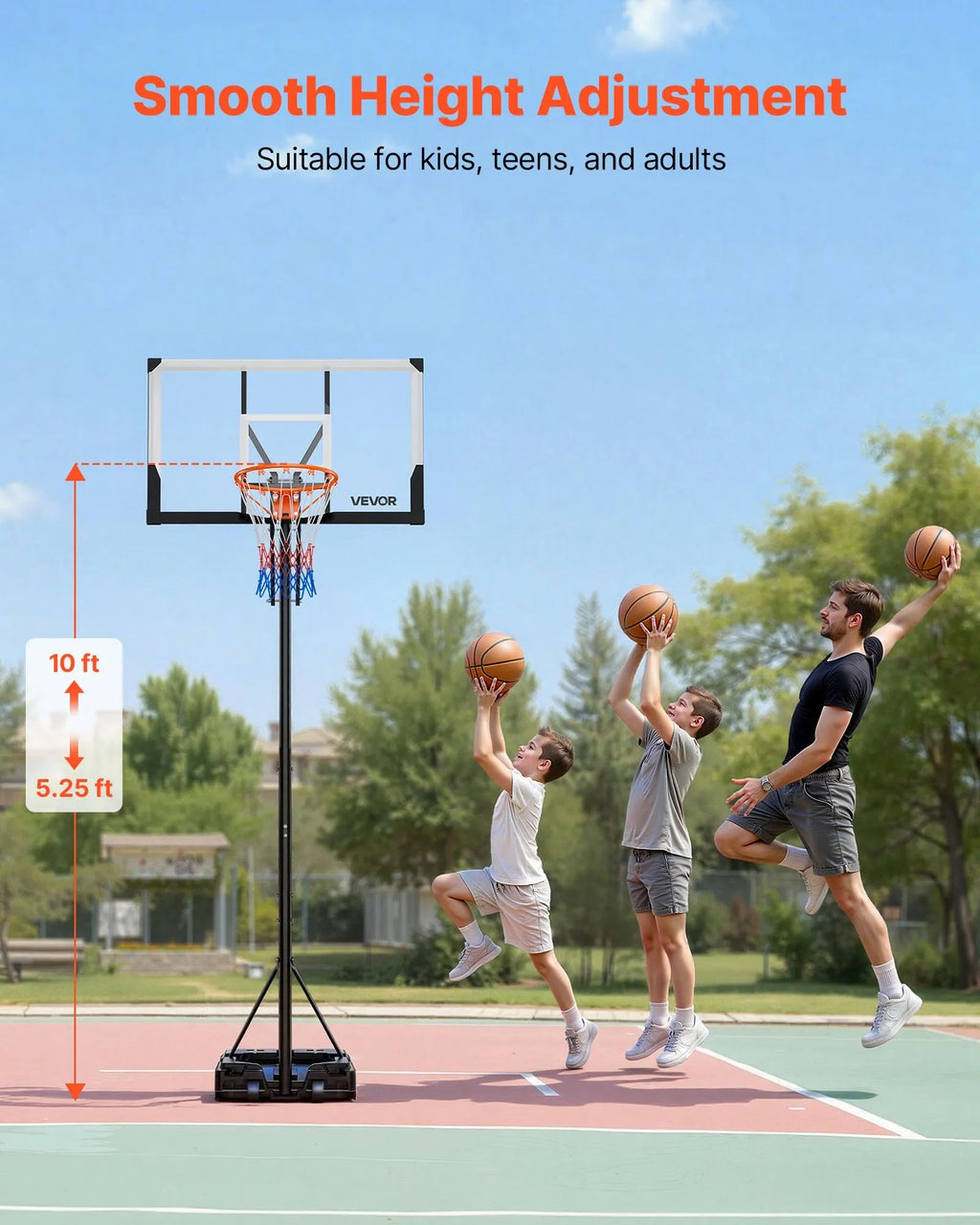 Bring home the excitement of basketball with the VEVOR Portable Basketball Stand, featuring a 5.25 to 10 ft adjustable hoop, durable 48-inch PC backboard, and smooth mobility. Perfect for kids, teens, and adults, this portable system ensures stability, weather resistance, and flexible gameplay for indoor and outdoor fun.