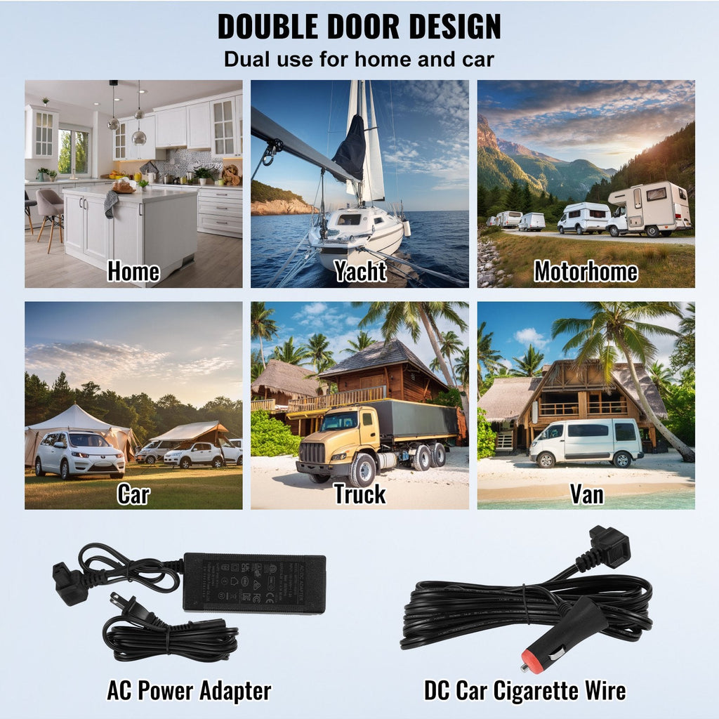 Dual Use for Home & Car: Powered by both AC (100-240V) for home use and DC (12/24V) for car use, making it perfect for long drives, camping, and home storage.