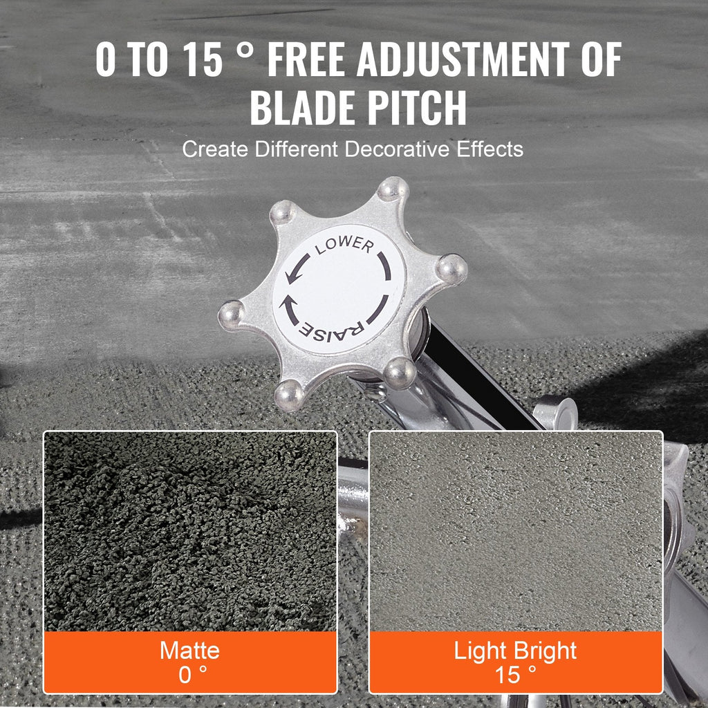 Tackle large-scale concrete finishing projects with precision using the VEVOR 38" Walk-Behind Power Trowel. Engineered for professionals, this gas-powered machine delivers robust 6HP performance, perfect for smoothing and finishing large concrete surfaces. Featuring a 38-inch floating disc and 35-inch trowel blade, this trowel provides seamless, consistent results. Its durable steel construction and ergonomic handle design ensure safety and efficiency on the job site. Ideal for contractors and serious DIYers working on floors, pavements, or foundations.