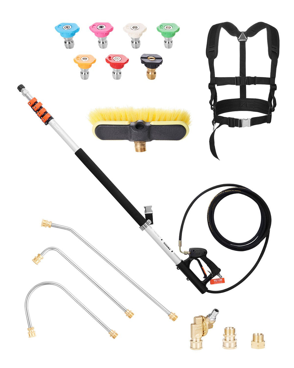 The VEVOR Pressure Washer Telescoping Wand is designed for efficient and convenient high-pressure cleaning, featuring a 21 ft telescoping wand and a brush head for versatile cleaning. Built with a durable aluminum wand and adjustable buckles, it allows you to easily reach high places without the need for a ladder. Compatible with water pressure up to 4000 psi, this pressure washer wand ensures high-quality performance for cleaning tasks in hard-to-reach areas like rooftops, windows, and walls.