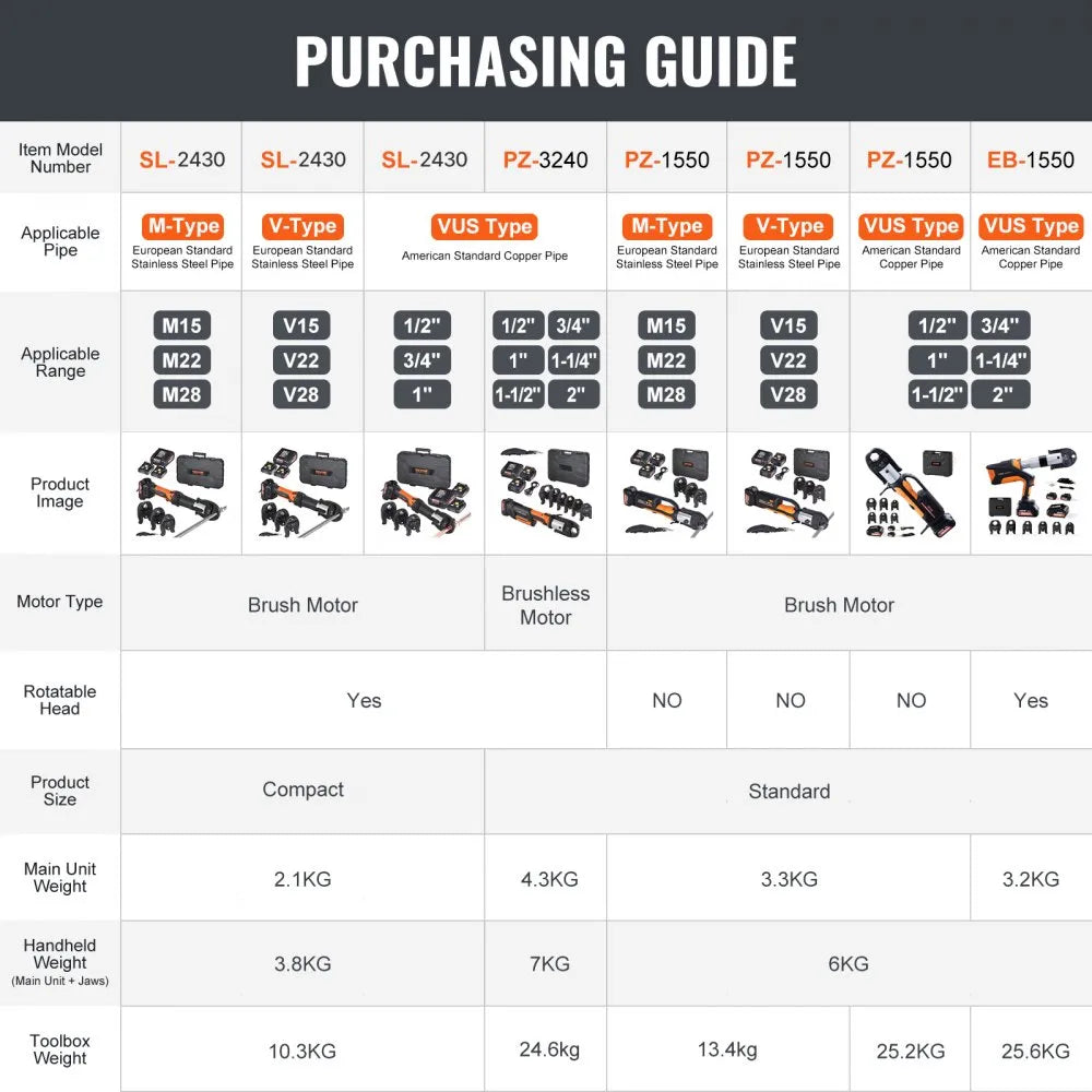 The VEVOR 18V Electric Pipe Crimping Tool is a professional-grade solution for stainless steel, copper, and PEX pipes ranging from 1/2" to 2". Featuring a high-performance brushless motor and 360° rotation automatic crimper, it delivers rapid, precise, and consistent crimps with minimal effort. Equipped with six versatile pro press jaws, this tool is engineered for durability and long-lasting use with a rated output force of 32KN and a maintenance cycle of up to 30,000 crimps. Lightweight and easy to operate, it is ideal for plumbing, HVAC, and professional pipe installations.