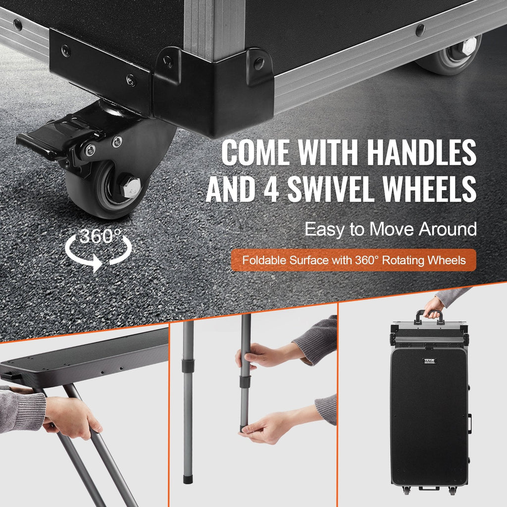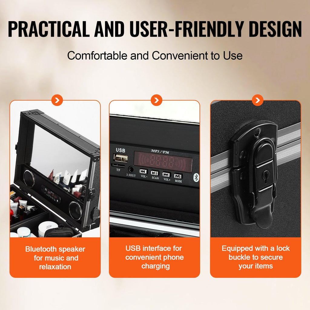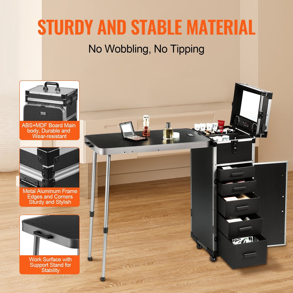 The VEVOR Professional Makeup Train Case is the ultimate cosmetic organizer for makeup artists and beauty professionals. Designed for maximum storage capacity, this case features extra-large trolley storage with a workbench top supported by sturdy legs for convenience. Crafted with durable ABS, MDF board, and aluminum frame, this lightweight yet robust case can withstand daily use. Equipped with 360° swivel wheels for easy mobility, it's perfect for on-the-go beauty professionals who need both a mobile workstation and a spacious organizer. The user-friendly design includes ample compartments, making it perfect for storing all your beauty essentials. Available in sleek black, it combines style with functionality.