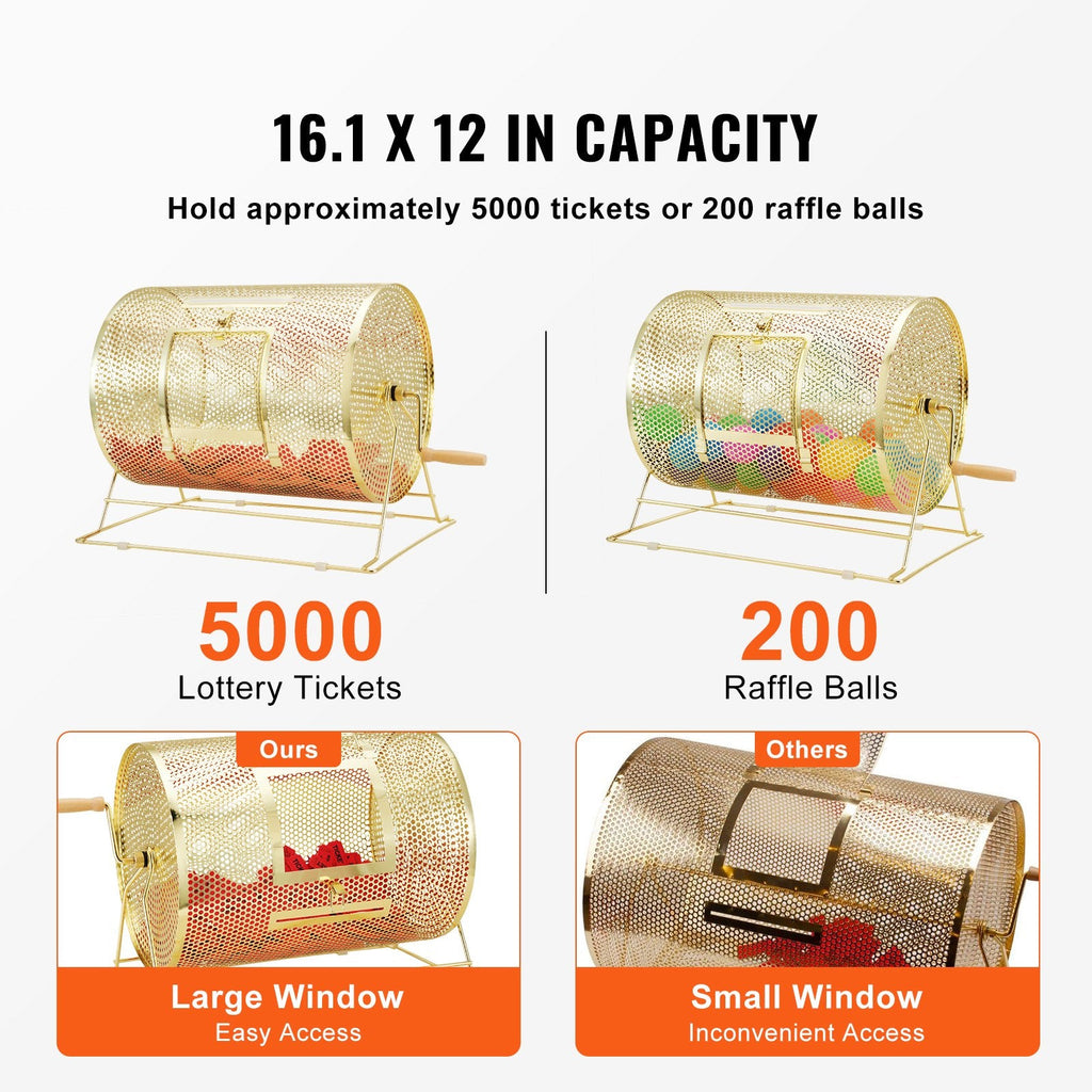 The VEVOR Raffle Drum is designed for large events, offering a robust and stylish way to conduct raffle draws. With a large capacity to hold up to 5000 tickets or 200 ping pong balls, this brass-plated metal spinning cage ensures randomness and fairness in lottery-style games. The durable drum is equipped with a solid wood handle for easy operation, making it ideal for bingo, ballots, or any event requiring transparent, secure drawing mechanisms. Its sturdy construction ensures long-lasting performance, while the refined details enhance its professional look.