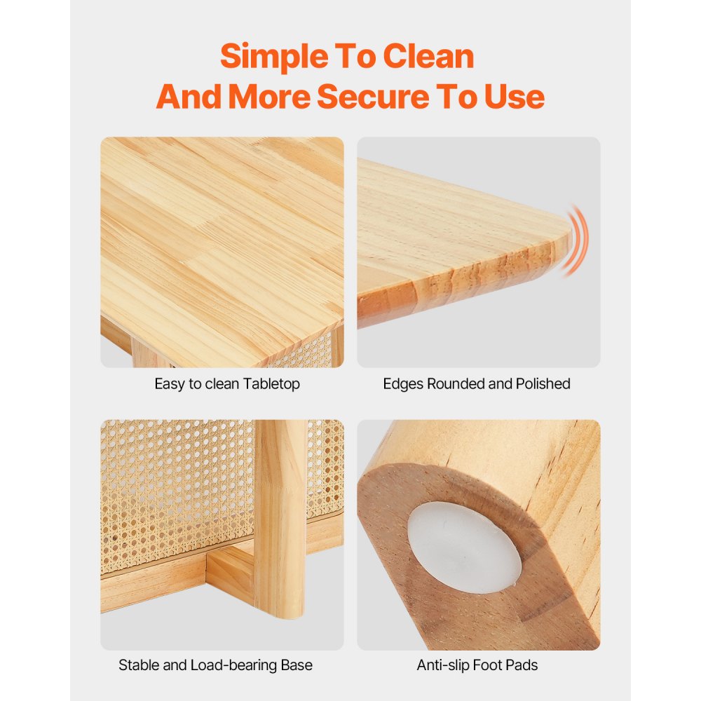 Add a touch of elegance to your living room with the VEVOR Rattan Coffee Table. Designed with a spacious surface and made from premium rubberwood and PE rattan materials, this table offers both durability and style. The one-tier design provides ample space for your essentials while keeping your living room tidy and organized. The sturdy frame and table support can hold up to 250 lbs, ensuring long-lasting use. With easy assembly and a versatile design, this coffee table complements a variety of decor styles, from modern to rustic. The original wood color adds a natural charm that fits seamlessly into any home.