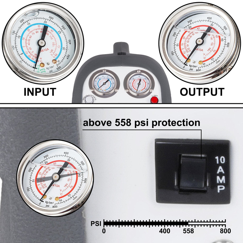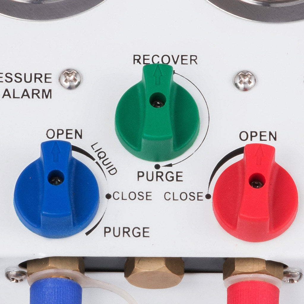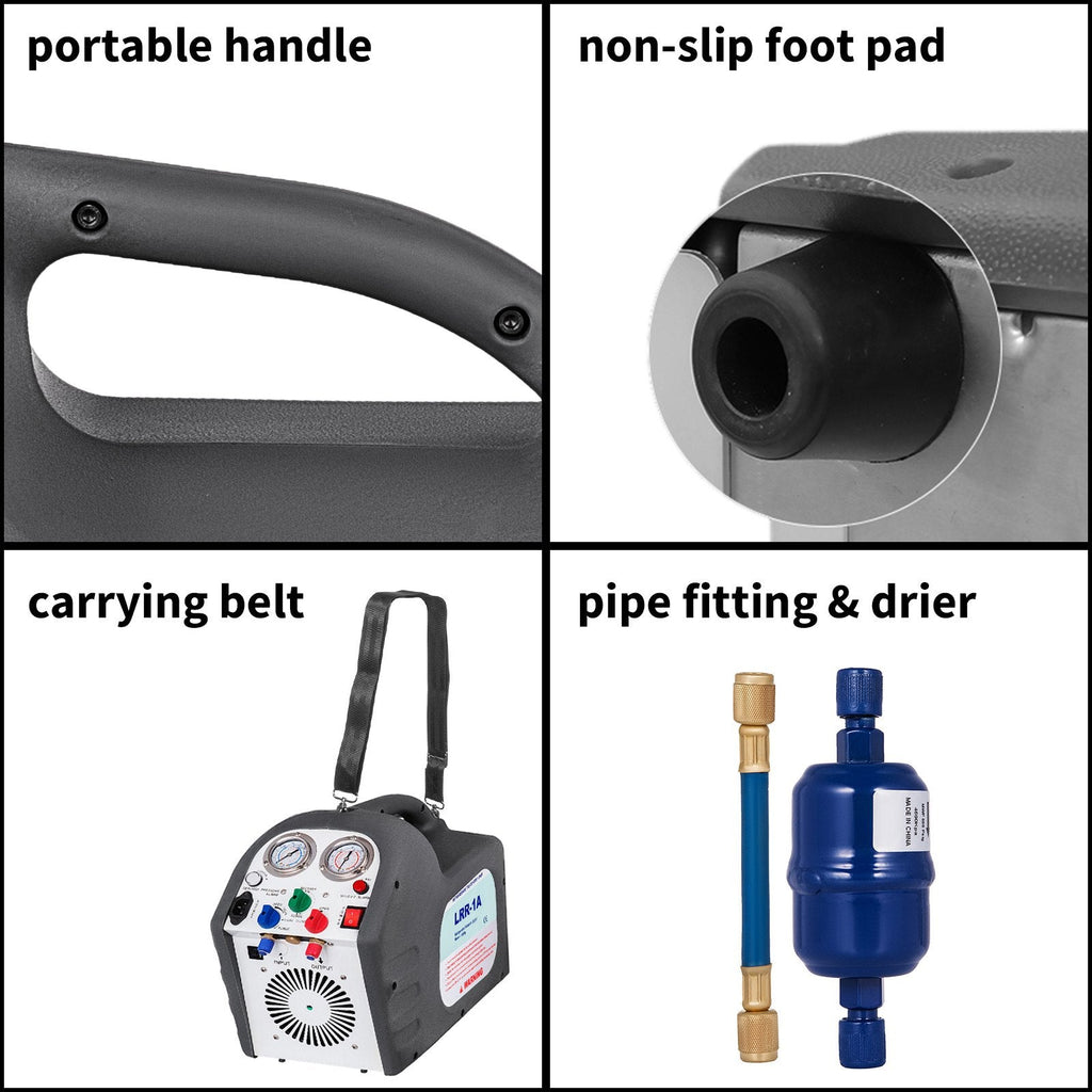 The VEVOR Refrigerant Recovery Machine is a portable, high-performance solution for HVAC and automotive refrigerant recycling. Featuring a 1/2 HP oil-less compressor, this unit offers fast and efficient recovery with support for vapor, liquid, and push-pull modes. Its precise pressure gauge and high-pressure shut-off ensure safe operation, while an oversized condenser and fan enhance cooling efficiency. Ideal for professional repair tasks, this recovery machine is engineered for reliability and ease of use.