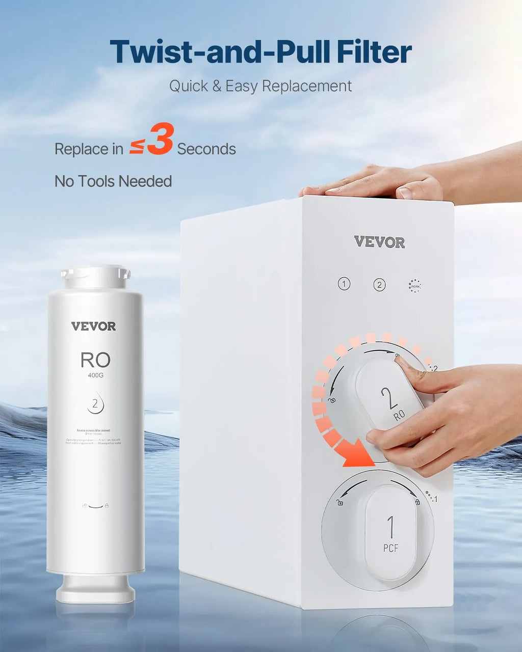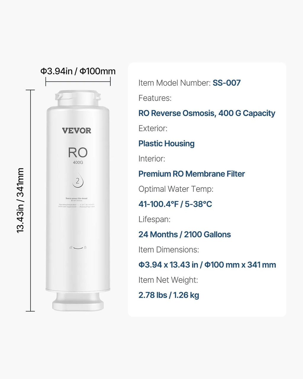 VEVOR Reverse Osmosis System Replacement Filter is designed specifically for the SS-001 under sink water filtration system, delivering advanced water purification and long-lasting freshness. Equipped with a premium RO membrane, this filter effectively reduces contaminants, impurities, and unwanted particles to provide clean and great-tasting drinking water. The durable plastic housing protects the internal filtration components, ensuring consistent performance and reliability. With a 360° rotating inlet design, installation and replacement are quick and hassle-free. Built for long-term use, this replacement filter offers up to 24 months or 2100 gallons of filtration, making it a reliable solution for maintaining high-quality purified water in your home.
