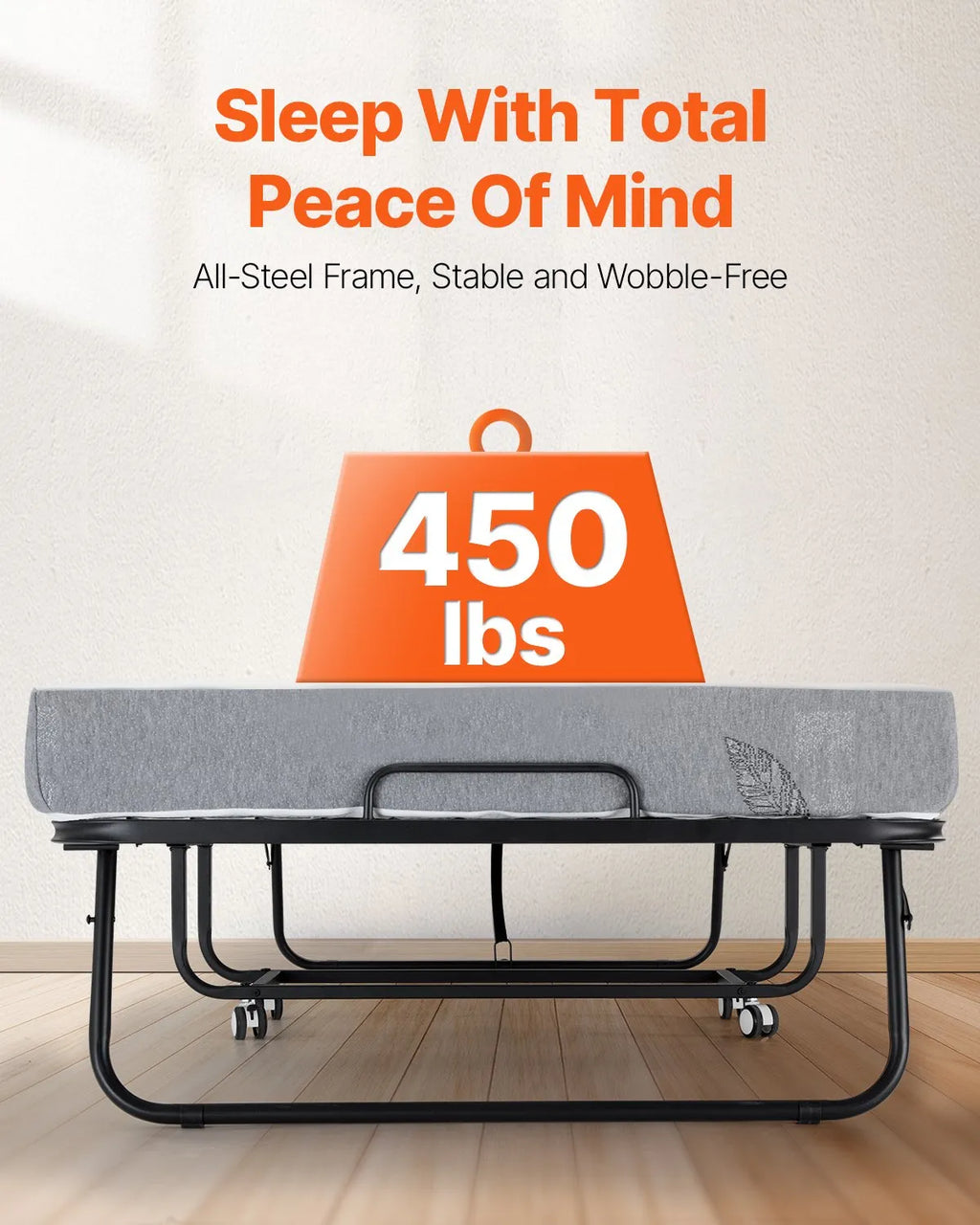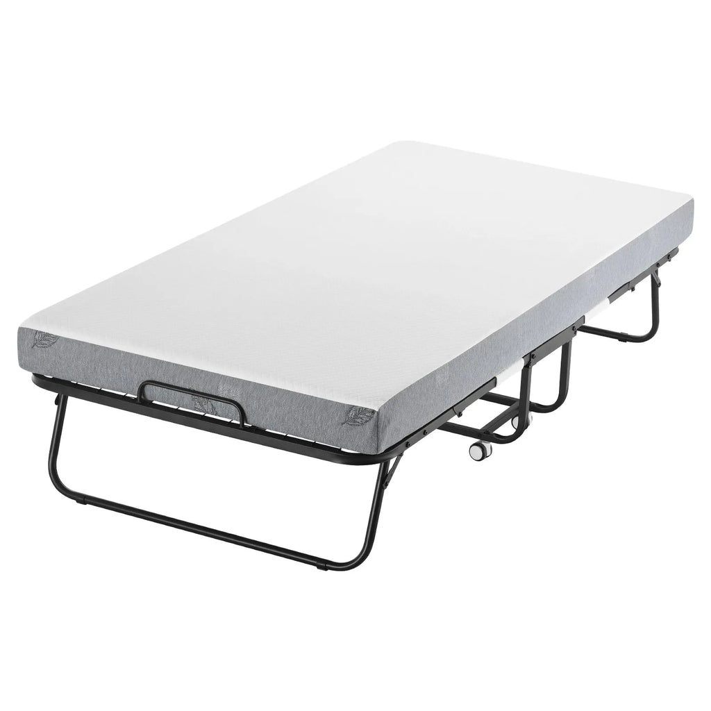 VEVOR Rollaway Bed Folding Bed with a 5-inch foam mattress provides a comfortable and convenient sleeping solution for guests and small spaces. Designed with a sturdy metal frame and durable construction, this foldable bed supports up to 450 lbs, ensuring reliable strength and stability. The high-density foam mattress offers long-lasting comfort, while the soft polyester cover enhances durability and ease of maintenance. With smooth-rolling wheels and a compact folding design, this bed can be easily moved and stored when not in use. Ideal for guest rooms, apartments, dormitories, or offices, it delivers comfort, practicality, and quick setup whenever an extra sleeping space is needed.