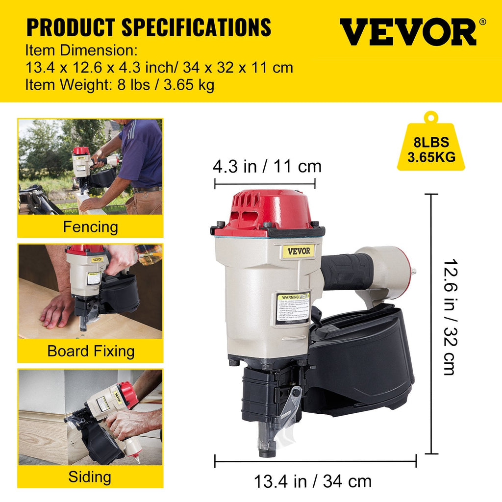 The VEVOR Roofing Nail Gun CN70 is a durable and efficient coil nailer engineered for roofing and siding applications. Designed to handle nails from 1-3/4 inches to 2-3/4 inches, this 15-degree coil nailer delivers powerful, accurate nail driving for a wide range of fastening tasks. With its adjustable PC magazine and high-speed firing capability, the CN70 offers professional-grade performance, making it an excellent choice for contractors and advanced DIYers looking for reliability and precision.