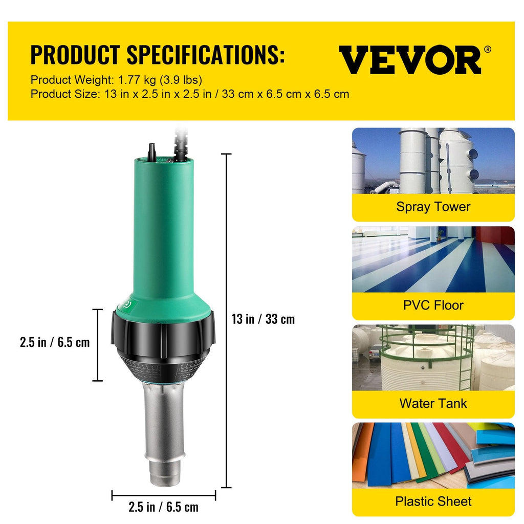 The VEVOR Roofing Welder is a powerful 1600W hot air plastic welder designed for efficient PVC welding. This comprehensive 8-piece kit includes a 120V PVC heat gun equipped with a mica pipe heating core, ensuring reliable and consistent heating. With stepless temperature regulation from 104 to 1112°F (40 to 600°C), it allows precise control for various welding tasks. Perfectly suited for roofing and plastic welding applications, this kit is ideal for both professional contractors and DIY enthusiasts.