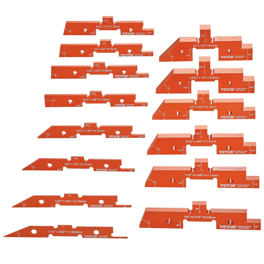 The VEVOR Router Table Setup Bars set features 14 precision aluminum setup blocks, designed for the most accurate measurements in routing and woodworking. Ideal for use with router tables and saws, this set includes height and depth gauges with clear laser-engraved markings to ensure exact measurement every time. The robust aluminum alloy construction and vibrant orange color make these tools durable and easy to spot in your workshop. The set offers 100 measurement options to accommodate a wide range of projects, all neatly organized in a secure storage case for convenience.