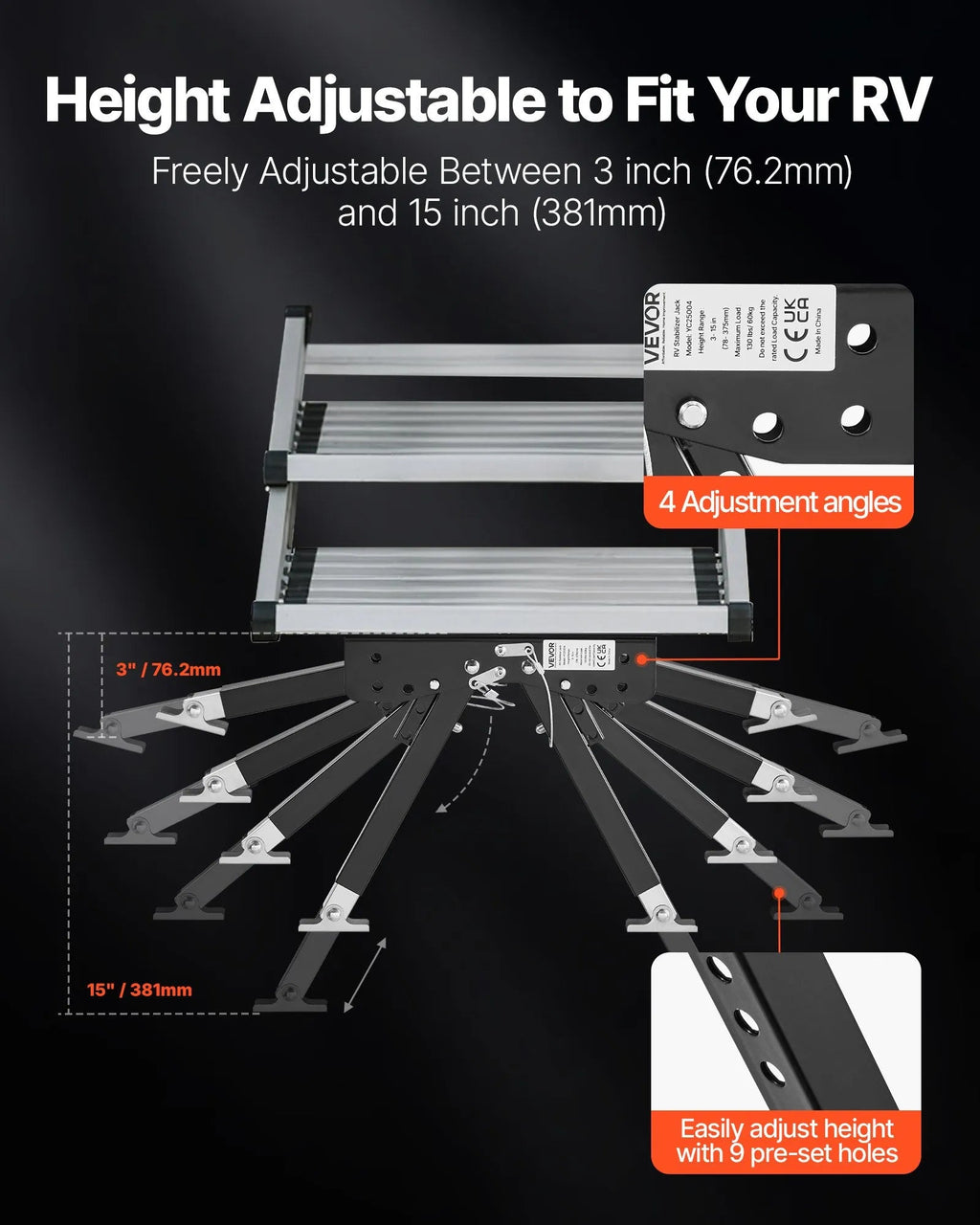 Adjustable Step Height: Easily adapts to various terrains with a 3 to 15-inch (76.2 to 381 mm) adjustable range and 9 precision holes. Keeps your RV steps steady on grass, gravel, sand, or uneven surfaces.