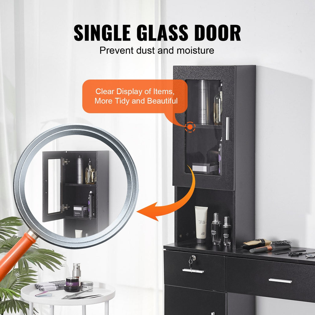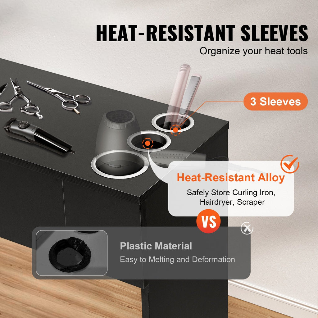 Upgrade your salon or spa setup with the VEVOR Wall Mount Salon Station — a sleek, modern solution designed for professional hair stylists and beauty experts. Finished in elegant matte black, this durable station features a spacious single-door cabinet, three-tier cubbies with a stylish glass door, and two drawers (one with a lock for secure storage). Equipped with three heat-resistant tool sleeves, it's perfect for organizing hot tools like blow dryers, curling irons, and flat irons. Built with premium MDF and heat-resistant alloy, this station combines functionality, safety, and a clean aesthetic to meet the demands of any busy salon.
